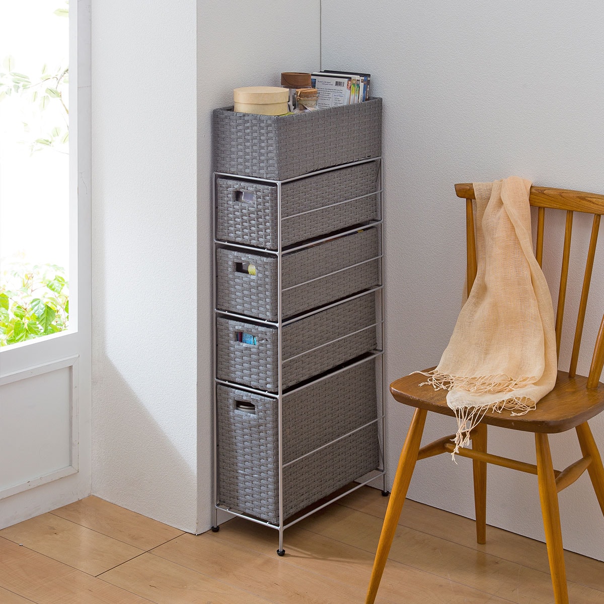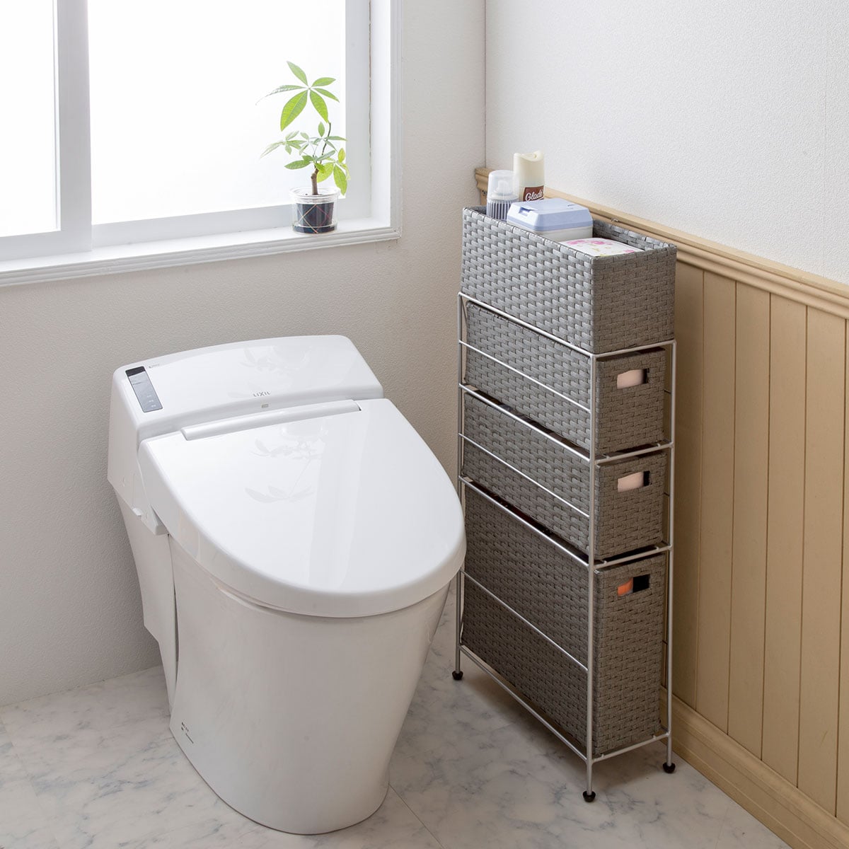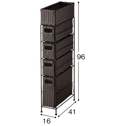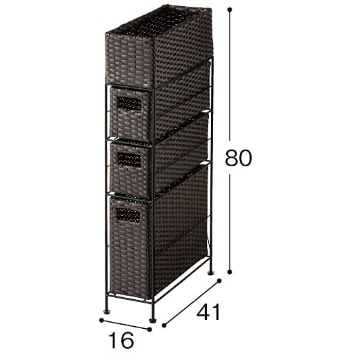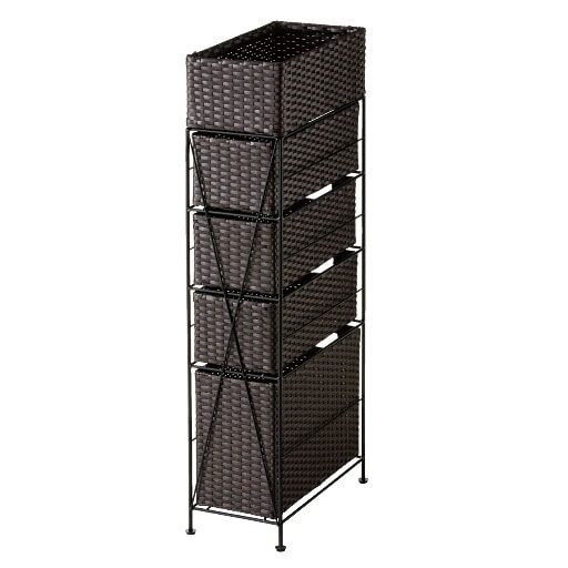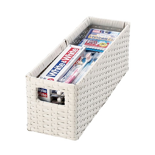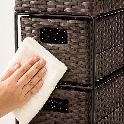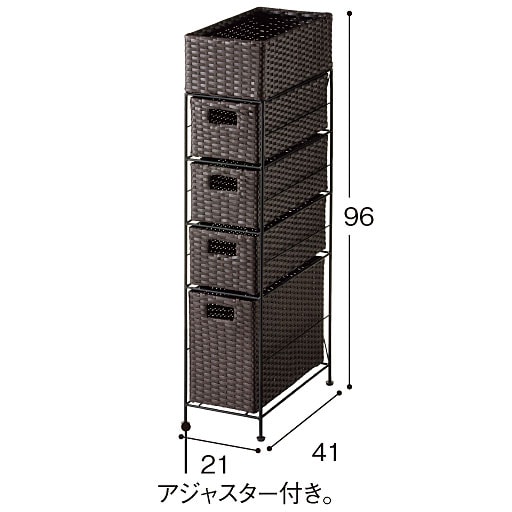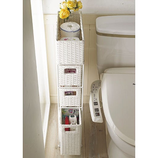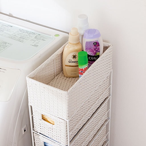 ちょっとしたすき間を有効利用! 樹脂素材をラタン風に編み込んだ、スリムタイプのおしゃれなランドリーチェストです。水や湿気に強く、通気性にも優れているので水回りで使用しても安心。トイレや洗濯機での収納、キッチンのすき間収納にもおすすめです。最上段はモノが落ちにくいバスケット形状。引き出しは取り出せるので持ち運びも可能です。アジャスター付きでガタツキも防止。使用シーンに合わせて選べるサイズとカラーをご用意しました。