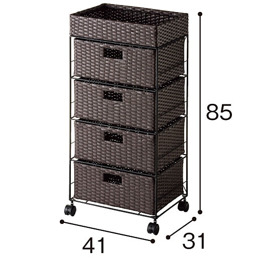樹脂素材をラタン風に編み込んだ、おしゃれなランドリーチェストです。水や湿気に強く、通気性にも優れているので水回りで使用しても安心。家族みんなのタオルや下着がまとめて収納できます。最上段はモノが落ちにくいバスケット形状。引き出しは取り出せるので持ち運びも可能です。ストッパー付きのキャスターで移動もラクラク。使用シーンに合わせて選べる豊富なサイズ展開をご用意しました。
