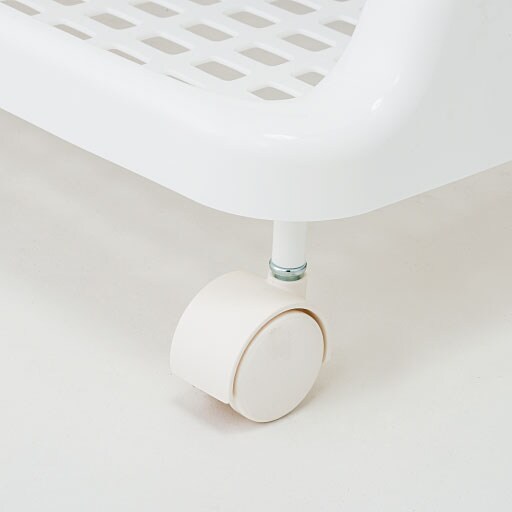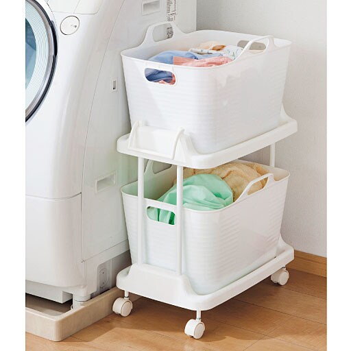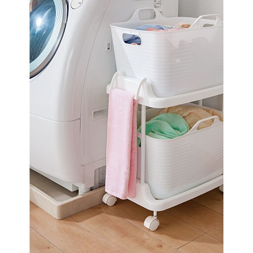 ポンポンしまえる、やわらか素材のバスケット付きワゴン。洗濯が終わったら、バスケットに洗濯物を入れてそのままベランダへ持って行けます。本体はすべてプラスチック製なので、汚れてもサッと拭き取れます。キャスター付きで移動も簡単。本体の下には体重計も収納OK。