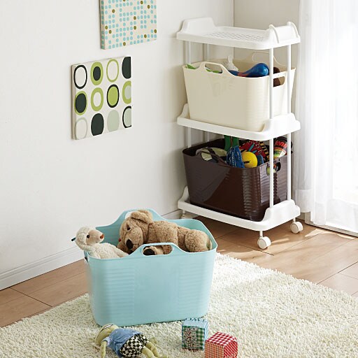 柔らかい素材のバスケットなので、子供部屋で玩具の収納ワゴンにもおすすめ。