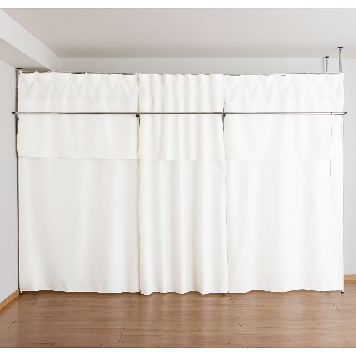 天井面の突っ張りパイプはそれぞれ独立して伸縮するので、梁などがあっても設置できます。 ※梁がある場合サイドカーテンはお使いいただけません。