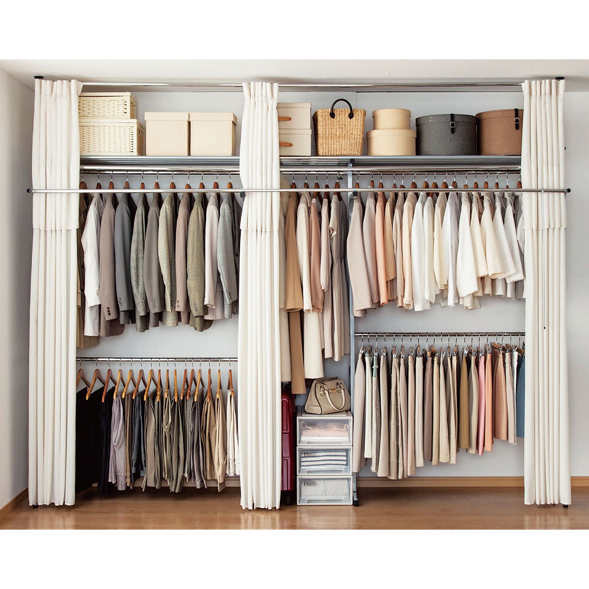 壁面を目いっぱいの衣類収納スペースに。縦横自在に伸縮するので設置場所を選びません。天井面のつっぱりパイプはそれぞれ独立して伸縮するので、梁などがあっても設置できます(梁がある場合サイドカーテンはお使いいただけません)。カーテン付きなので大切な衣類をホコリから守ります。サッと閉じればお部屋もスッキリ。頑丈な棚板にはスーツケースなどのかさばるモノもスッキリ片づけられます。