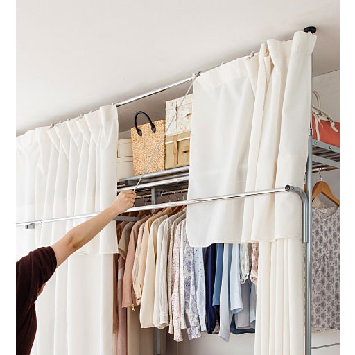 カーテン付きなので大切な衣類をホコリから守ります。 サッと閉じればお部屋もスッキリ。 E:サイドカーテンを使うと更にスッキリ。 (※梁がある場合サイドカーテンはお使いいただけません。)