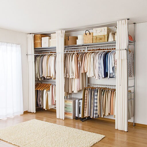 壁面を目いっぱいの衣類収納スペースに。縦横自在に伸縮するので設置場所を選びません。天井面のつっぱりパイプはそれぞれ独立して伸縮するので、梁などがあっても設置できます(梁がある場合サイドカーテンはお使いいただけません)。カーテン付きなので大切な衣類をホコリから守ります。サッと閉じればお部屋もスッキリ。頑丈な棚板にはスーツケースなどのかさばるモノもスッキリ片づけられます。