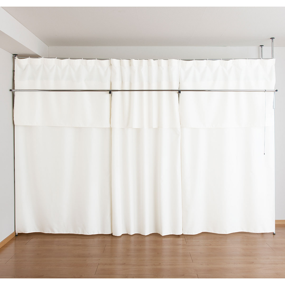 天井面の突っ張りパイプはそれぞれ独立して伸縮するので、梁などがあっても設置できます。※梁がある場合サイドカーテンはお使いいただけません。