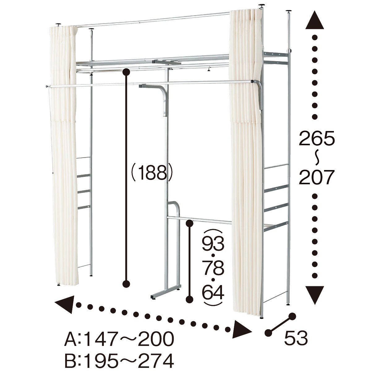 A (本体/幅147~200cm)・B (本体/幅195~274cm) サイズ寸法※寸法の単位はcm、( )内は内寸です。