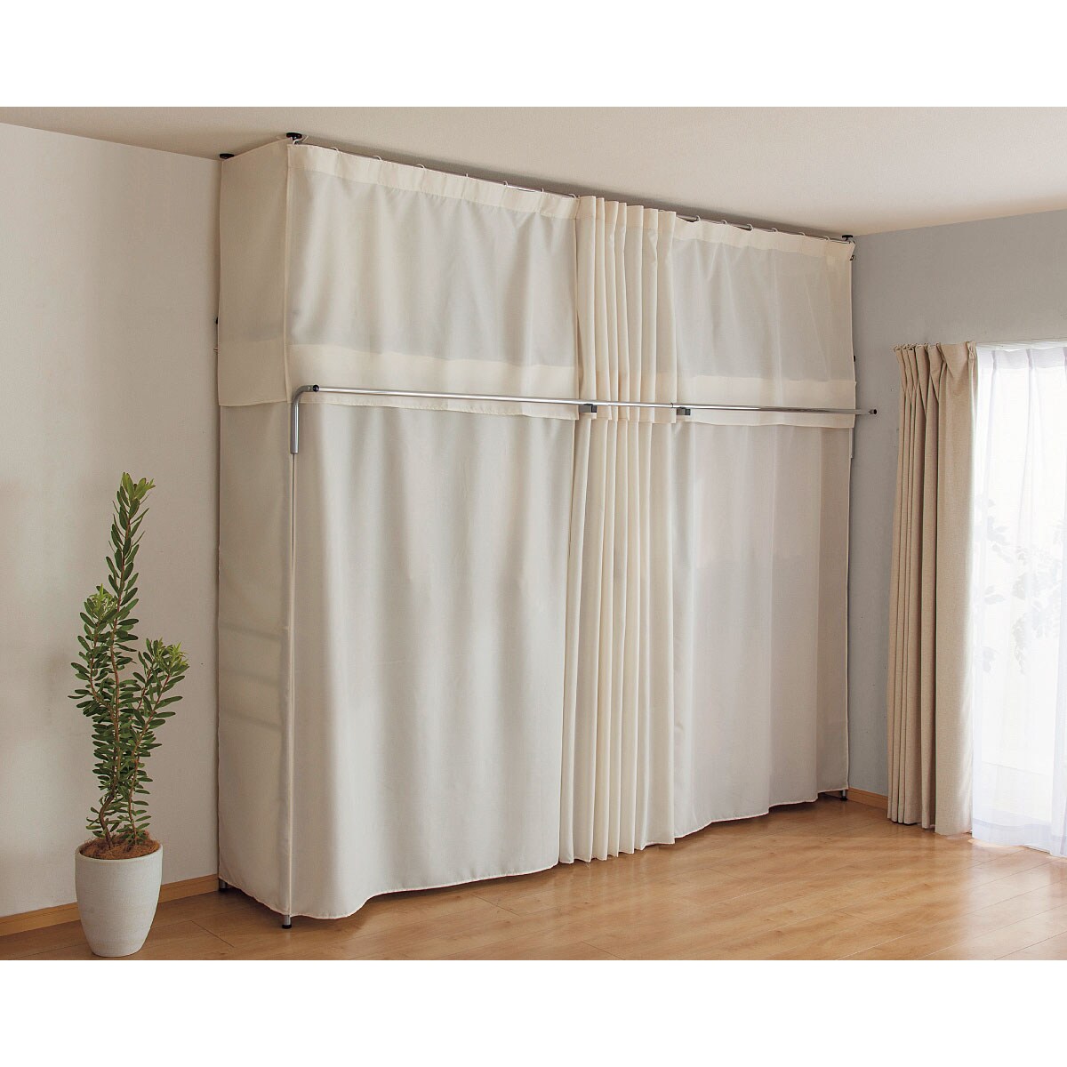 カーテン付きなので大切な衣類をホコリから守ります。 サッと閉じればお部屋もスッキリ。 E:サイドカーテンを使うと更にスッキリ。 (※梁がある場合サイドカーテンはお使いいただけません。)