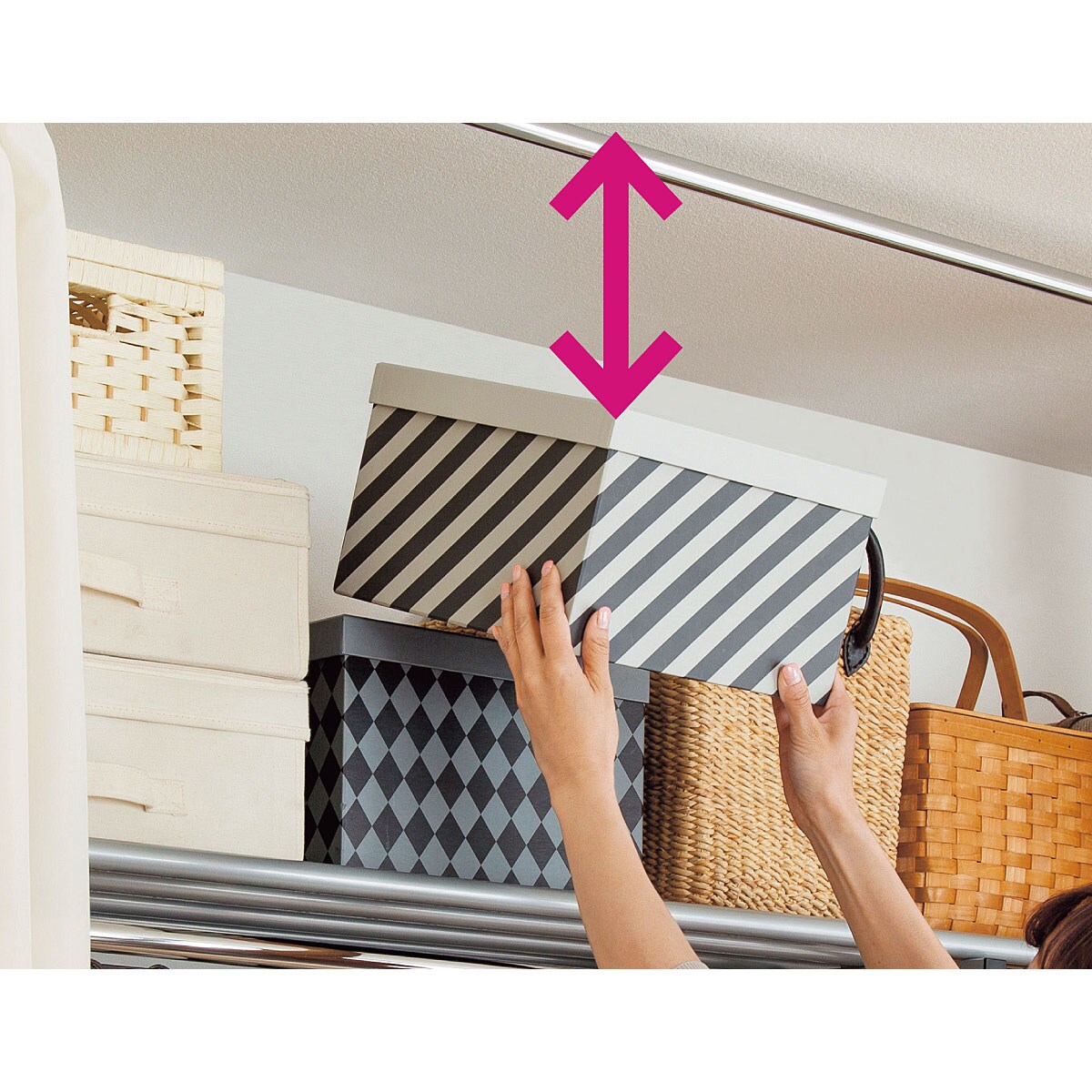 下段ハンガーは高さを3段階から選べます。上段に収納する衣類の丈に合わせて無駄なくスペースを有効活用。
