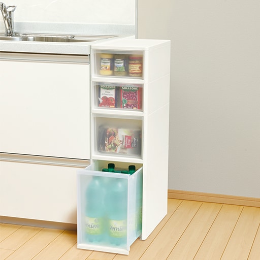 D 最下段の引き出しはローラー付き。重いペットボトルなどを収納しても、スムーズに引き出せます。