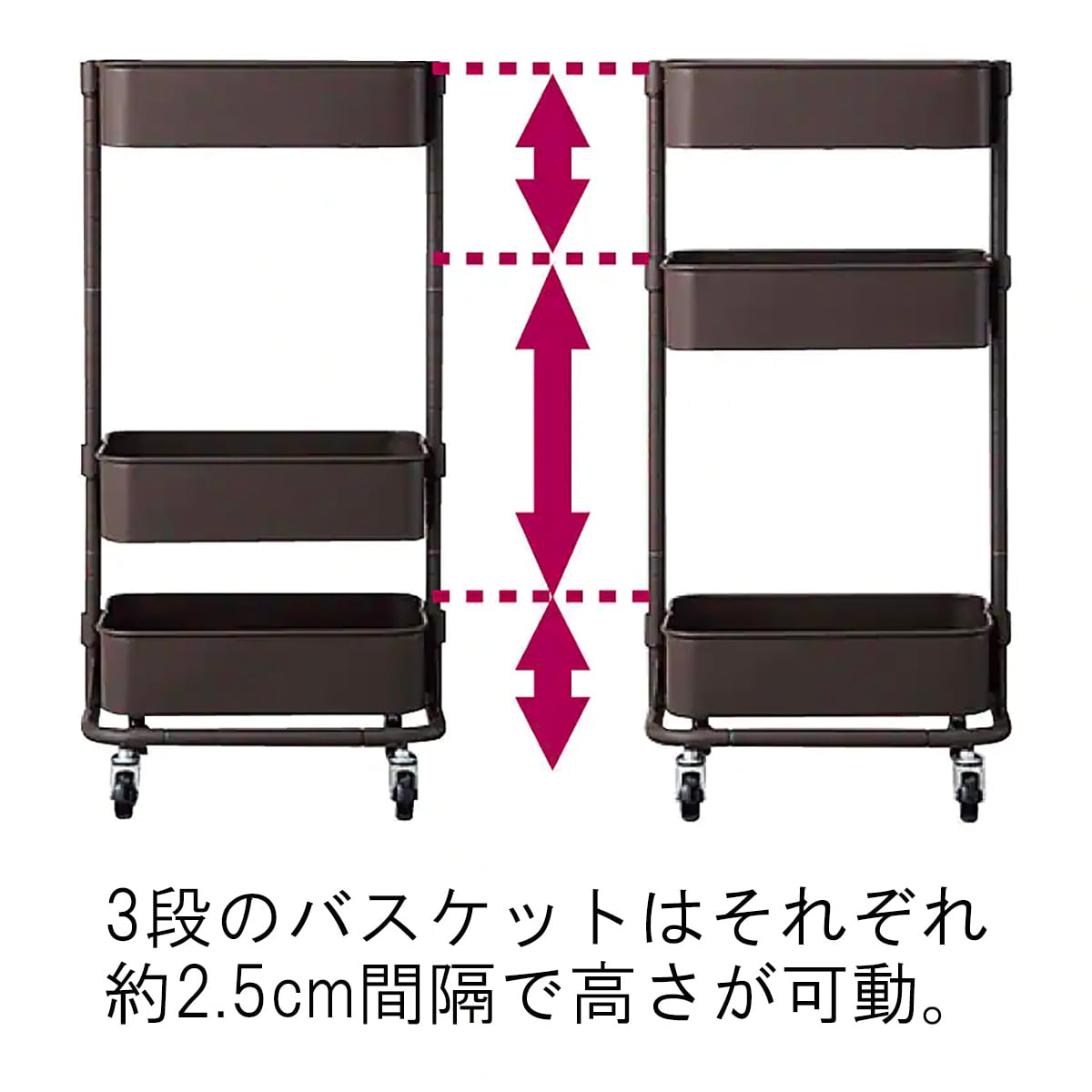 3段のバスケットはそれぞれ約2.5cm間隔で高さ調節ができます。