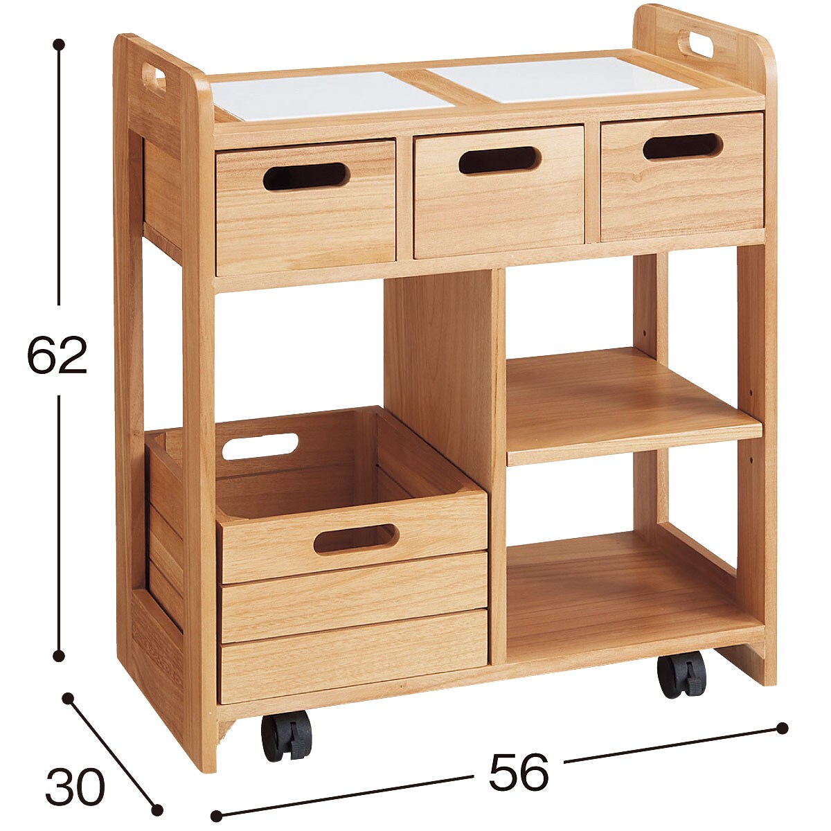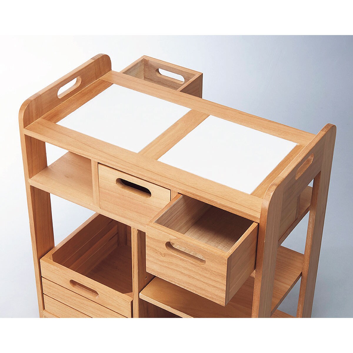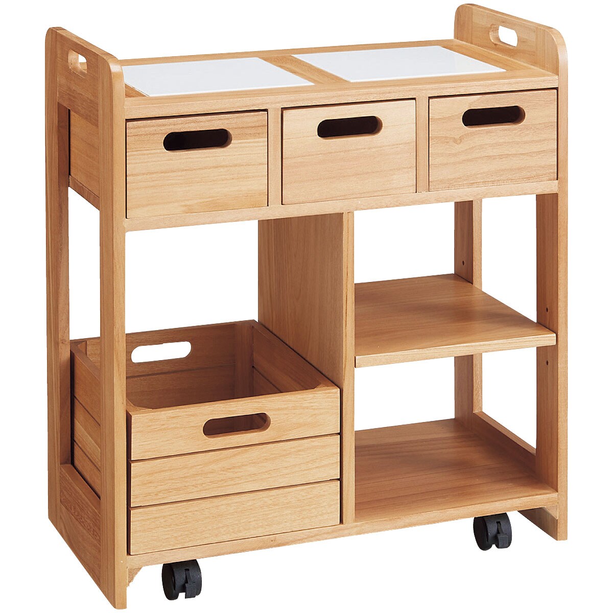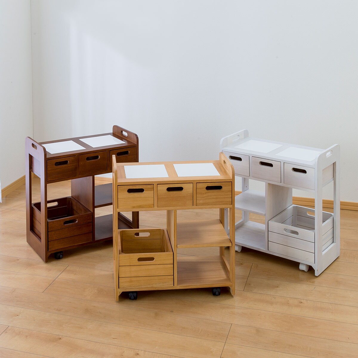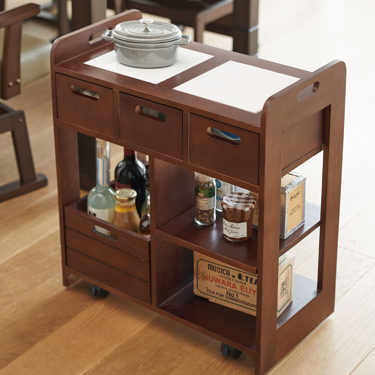 使い勝手のよいコンパクトサイズのキッチンワゴンです。天板はタイル張りで、熱いお鍋もちょい置きできます。引き出しは両面から引き出せるので対面での使用にも対応。引き出して持ち運びもできるので、カトラリーやランチョンマットをしまっておけばテーブルセッティングもスムーズに。