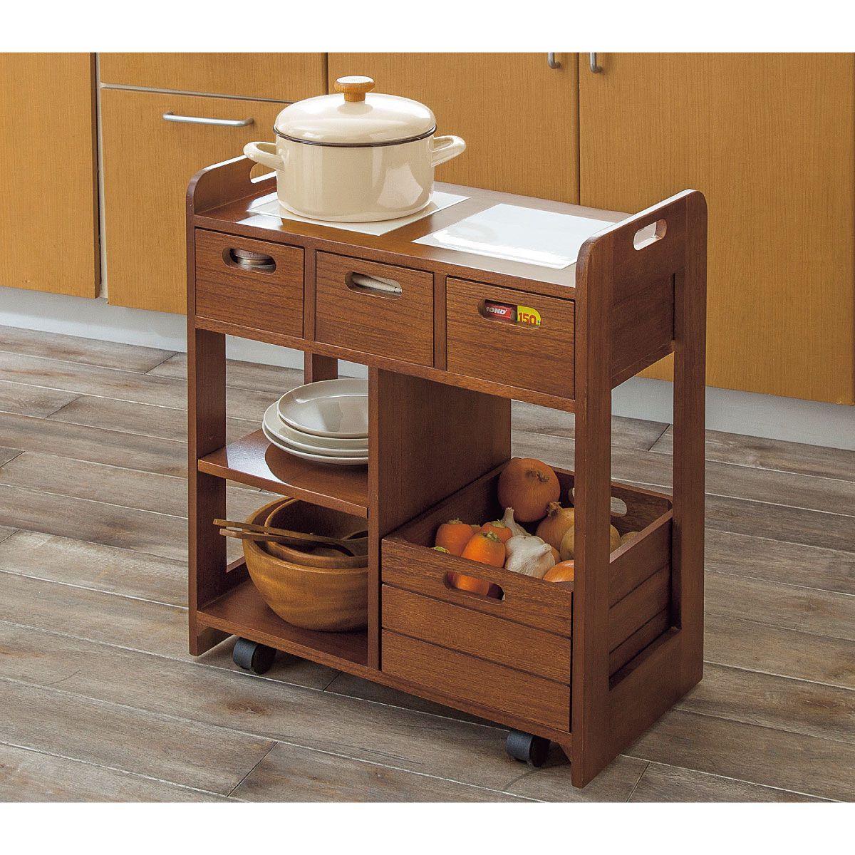 調理のサブテーブルや、お料理を運ぶサービスワゴンに。ダイニングテーブルの下に入るコンパクトサイズのキッチンワゴンです。