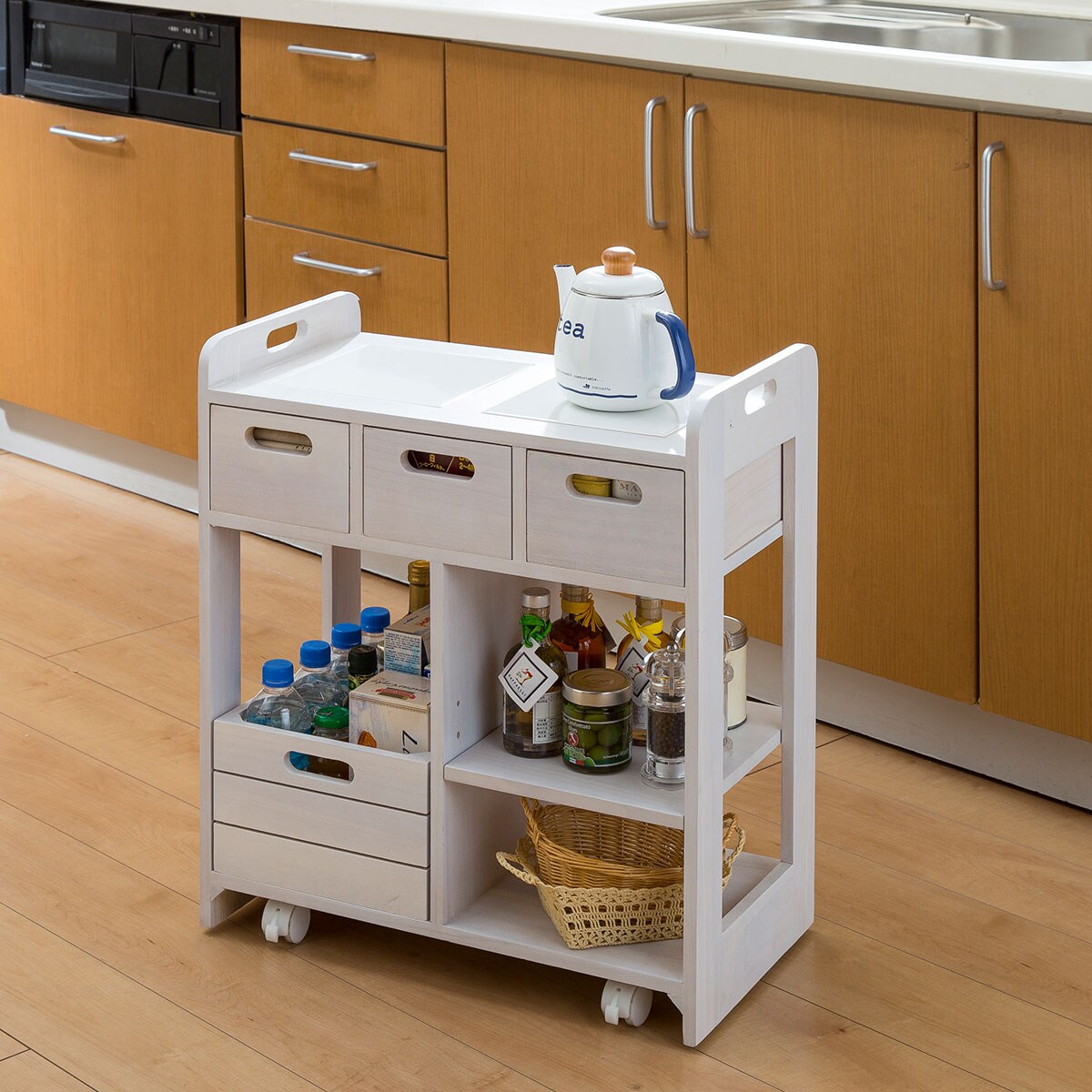 【完成品】調理のサブテーブルや、お料理を運ぶサービスワゴンに。ダイニングテーブルの下に入るコンパクトサイズのキッチンワゴンです。