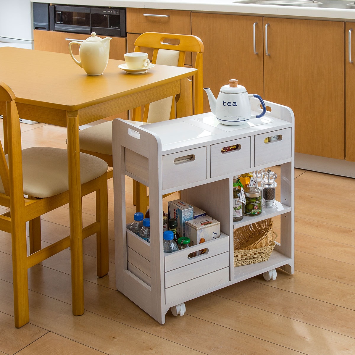 アンティックホワイトダイニングテーブルの下に入るコンパクトサイズのキッチンワゴンです。