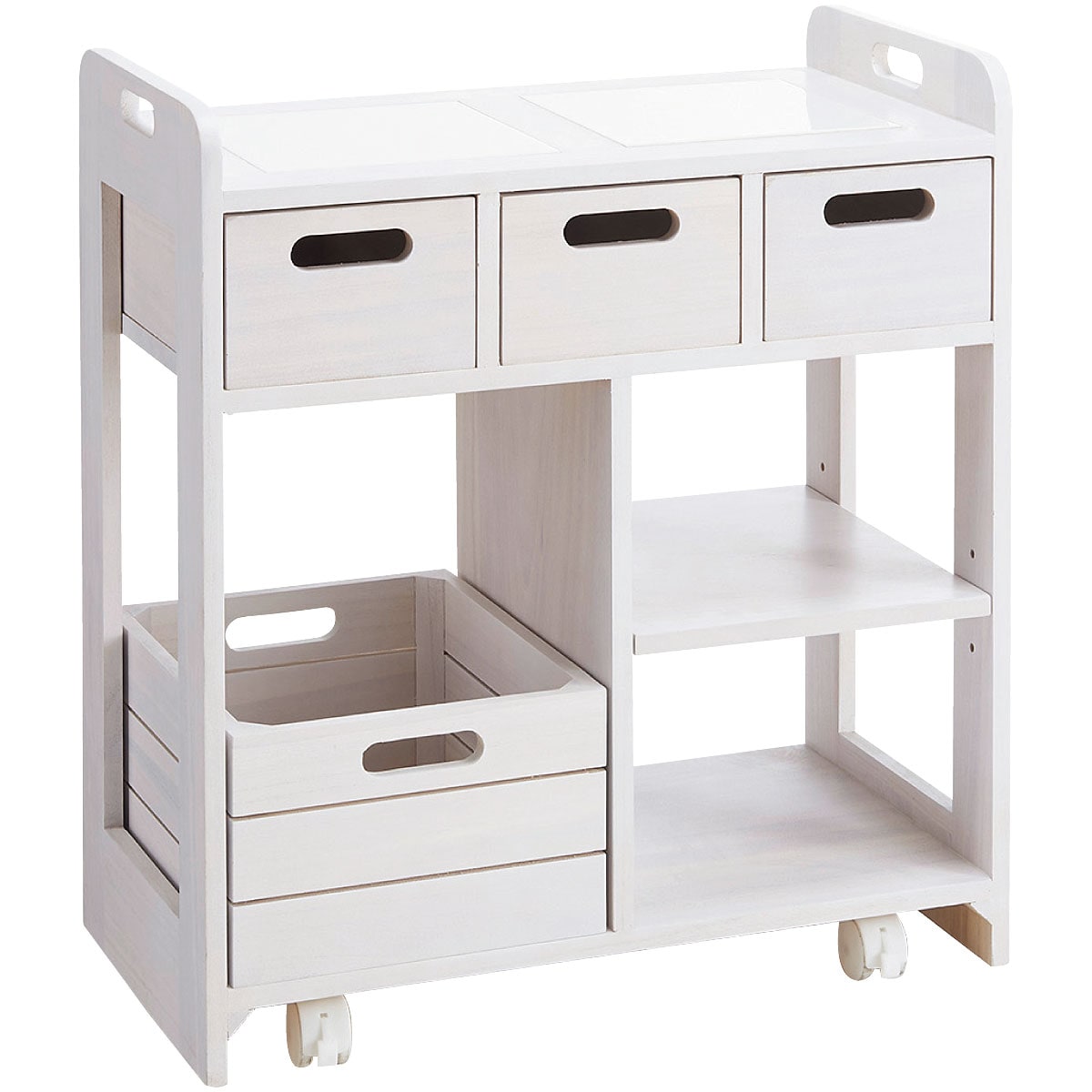 使い勝手のよいコンパクトサイズのキッチンワゴンです。天板はタイル張りで、熱いお鍋もちょい置きできます。引き出しは両面から引き出せるので対面での使用にも対応。引き出して持ち運びもできるので、カトラリーやランチョンマットをしまっておけばテーブルセッティングもスムーズに。