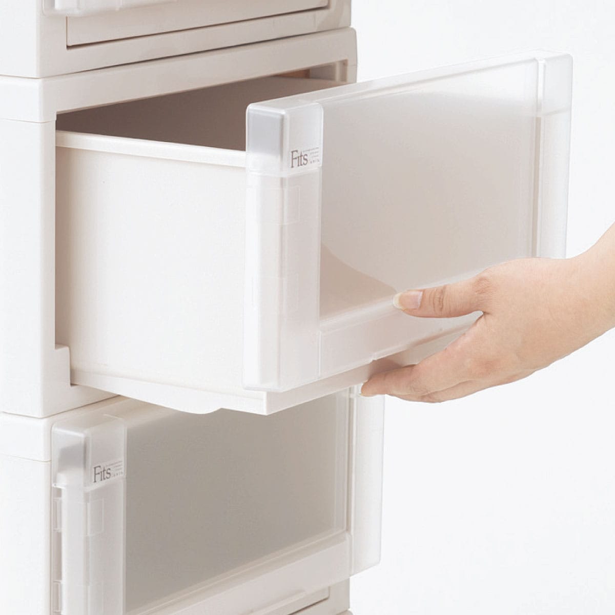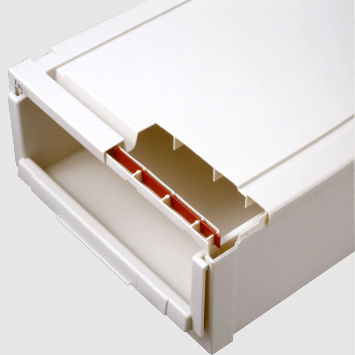 たわみが気になる、引き出しが前に落ちそうになる、といった収納ケースの悩みにお応えしました。天板の強度を上げ、連結パーツで前倒れを予防。軽い力で開け閉めでき、しっかり閉まるので安心。積み重ねてチェスト代わりにもどうぞ。