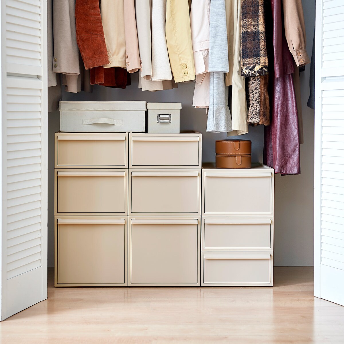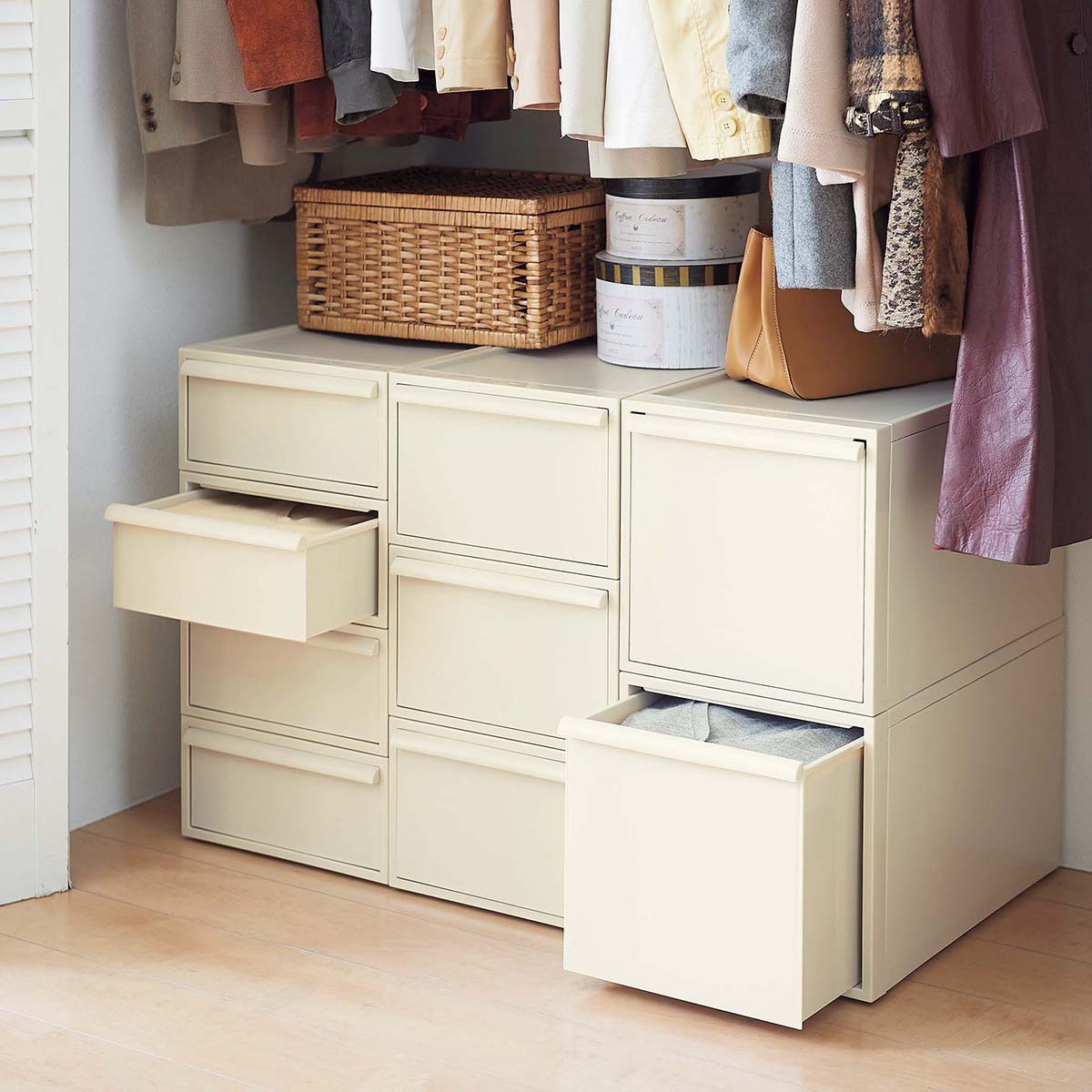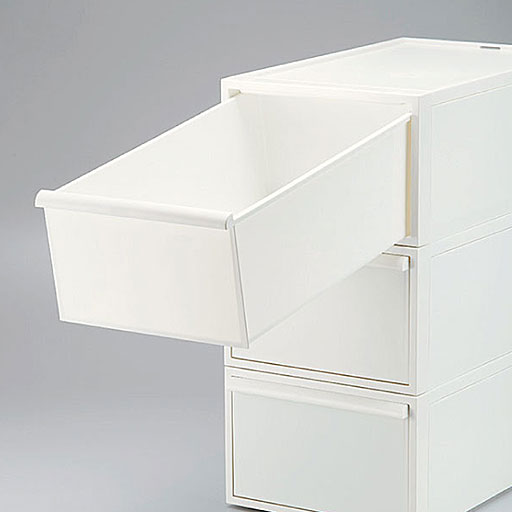 クローゼットの中にスッキリと収まるサイズ設計で使いやすい、クローゼットシステムです。Sサイズ4段・Mサイズ3段・Lサイズ2段を重ねて並べるとピタッと高さが揃うので、統一感のある収納スペースを作ることができます。引き出しの抜け落ちを防ぐストッパーや、重ねた時のズレを防ぐロック付きなど、細部にもこだわりました。シンプルなデザインなのでインテリアにもなじみます。
