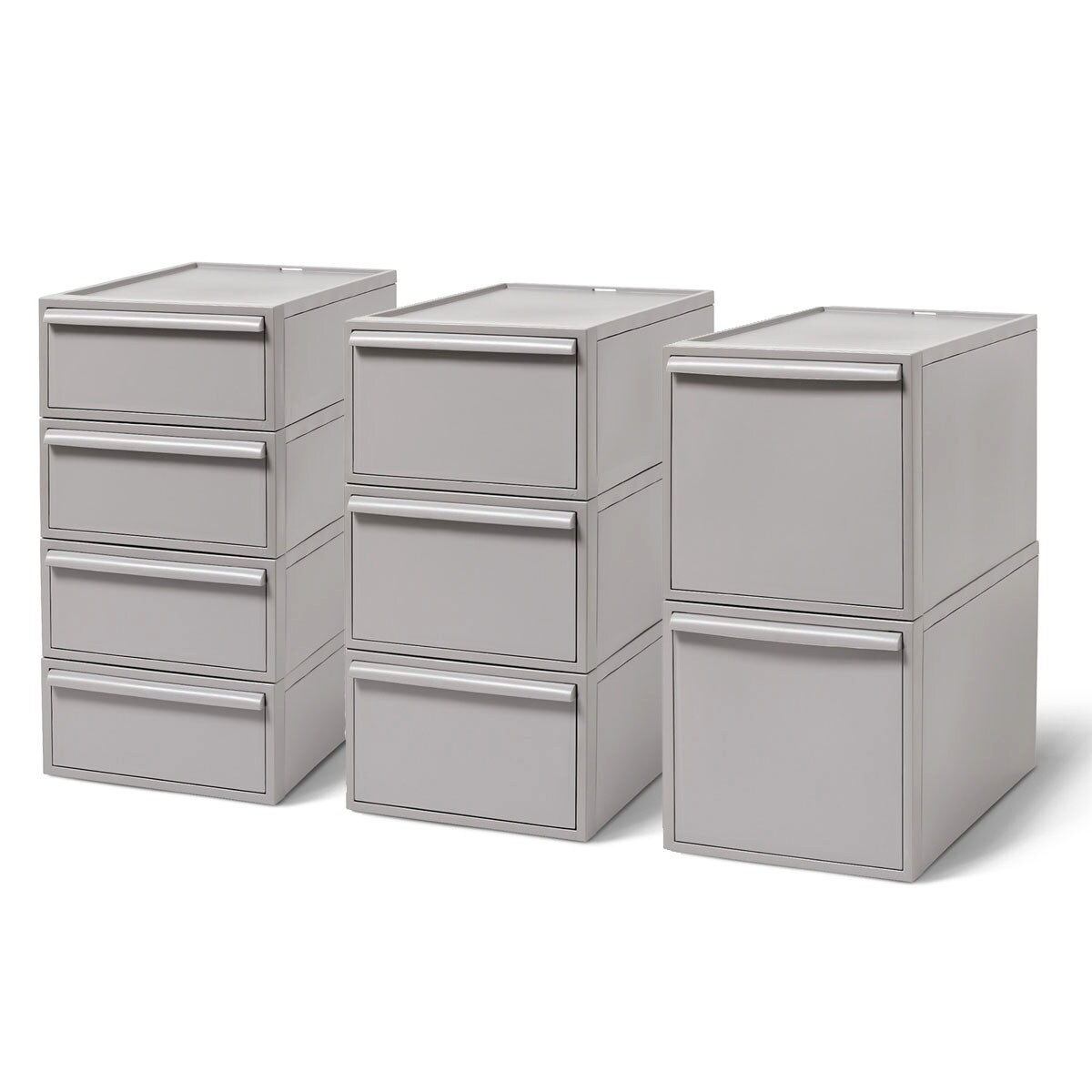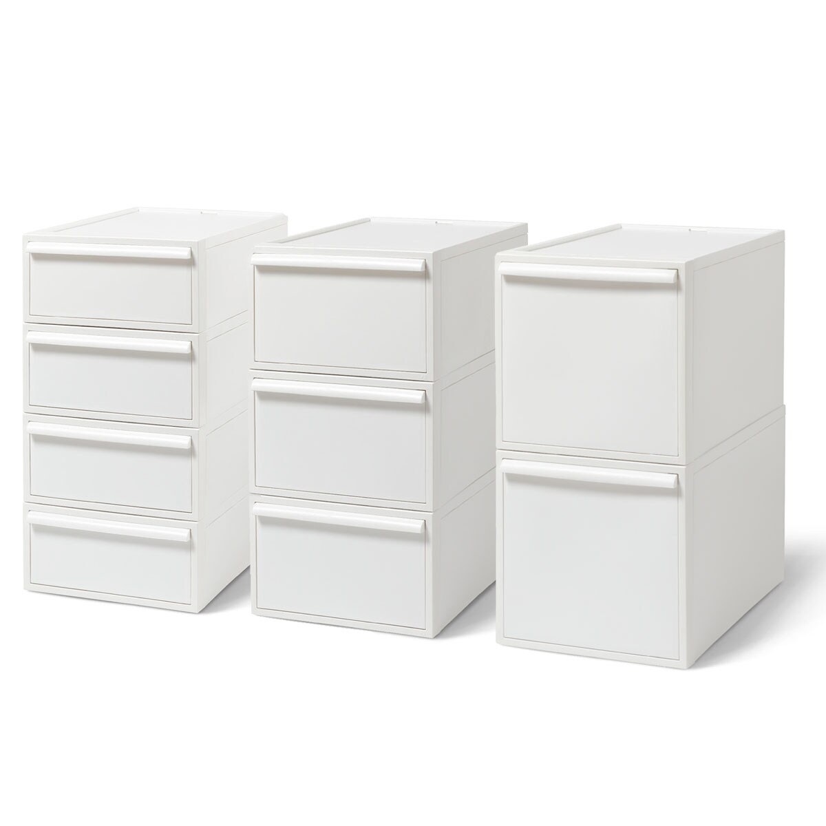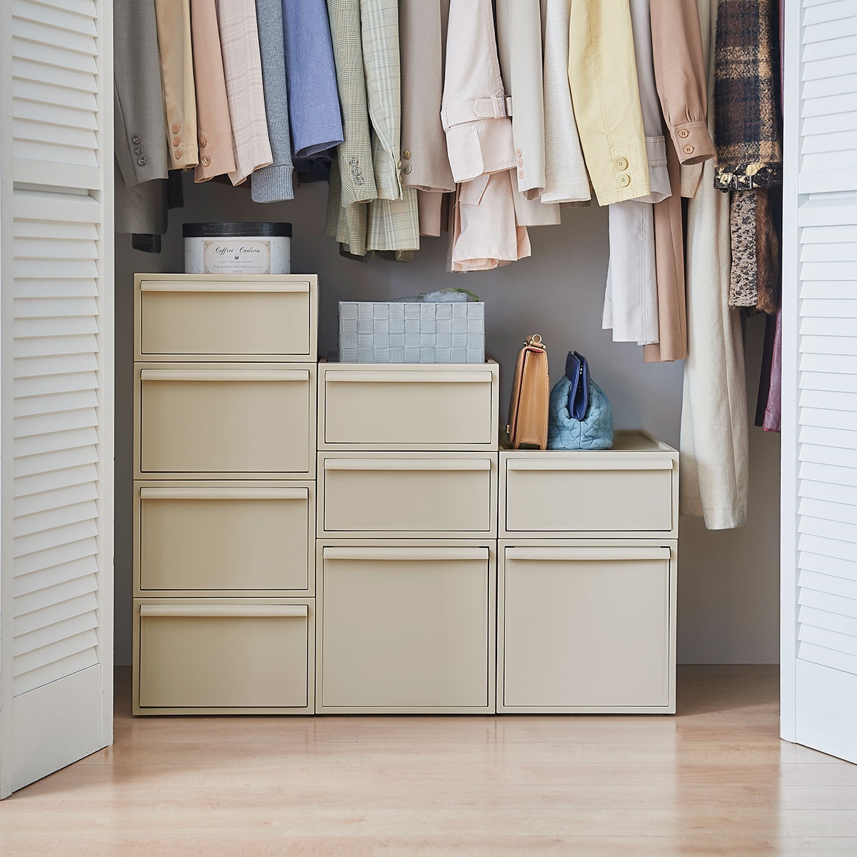 クローゼットの中にスッキリと収まるサイズ設計で使いやすい、クローゼットシステムです。Sサイズ4段・Mサイズ3段・Lサイズ2段を重ねて並べるとピタッと高さが揃うので、統一感のある収納スペースを作ることができます。引き出しの抜け落ちを防ぐストッパーや、重ねた時のズレを防ぐロック付きなど、細部にもこだわりました。シンプルなデザインなのでインテリアにもなじみます。