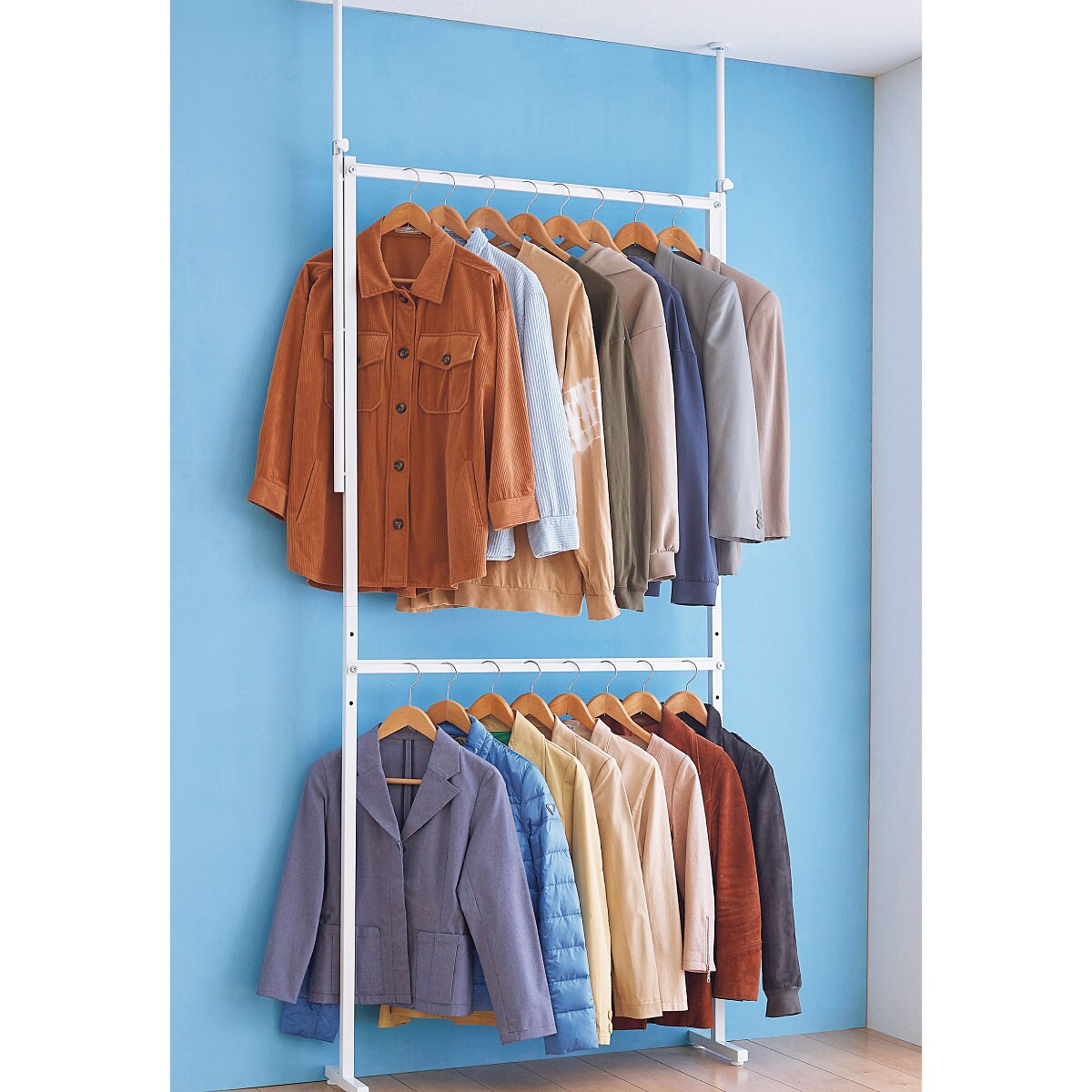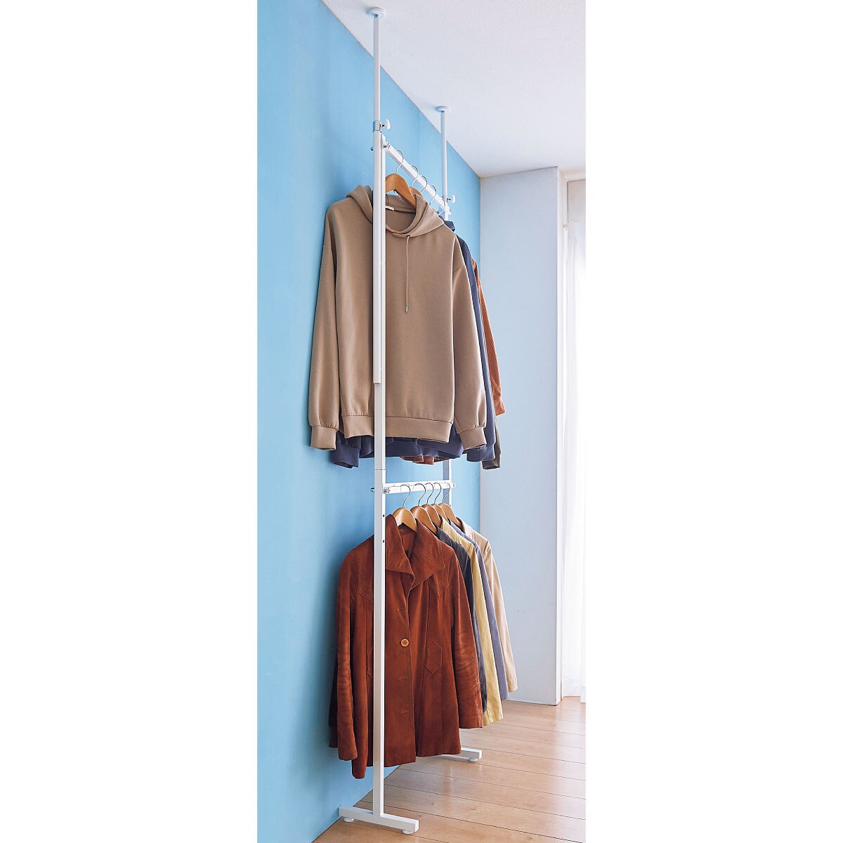 溝のあるハンガーバーに引っ掛けて、自然に斜め向きに収納できる省スペースハンガーラックです。斜め掛けすることでハンガーの肩幅より狭い奥行きに服がかけられます。つっぱり式なのでお部屋のちょっとしたスペースに設置可能。下段のハンガーバーは3段階に高さ調整できます。脱いだ服のちょい掛けやアウター用、見せる収納としてもおすすめです。