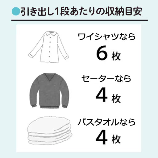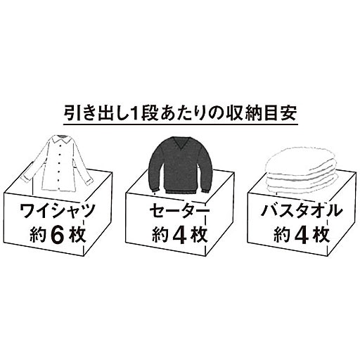 引き出し1段にワイシャツなら6枚、セーター・バスタオルなら4枚入ります。※収納枚数は目安です。素材やサイズによって異なります。