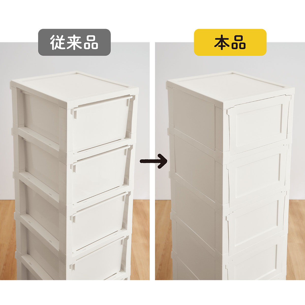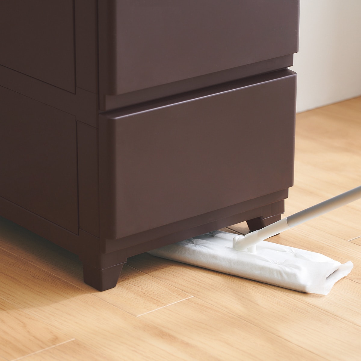 お掃除の手間が省ける、ホコリがたまりにくい収納ボックスです。背面・側面のパネルが壁となってホコリがたまりにくく、引き出しの中にも入りにくくなりました。水に強く汚れてもサッと拭き取るだけで清潔を保てます。高さのある家具調の脚付きなので、床下のホコリも屈まずお掃除シートで拭き取れてお掃除ラクラク! 差し込むだけの簡単組み立てで工具も不要です。技ありの賢い収納でもっと快適に。