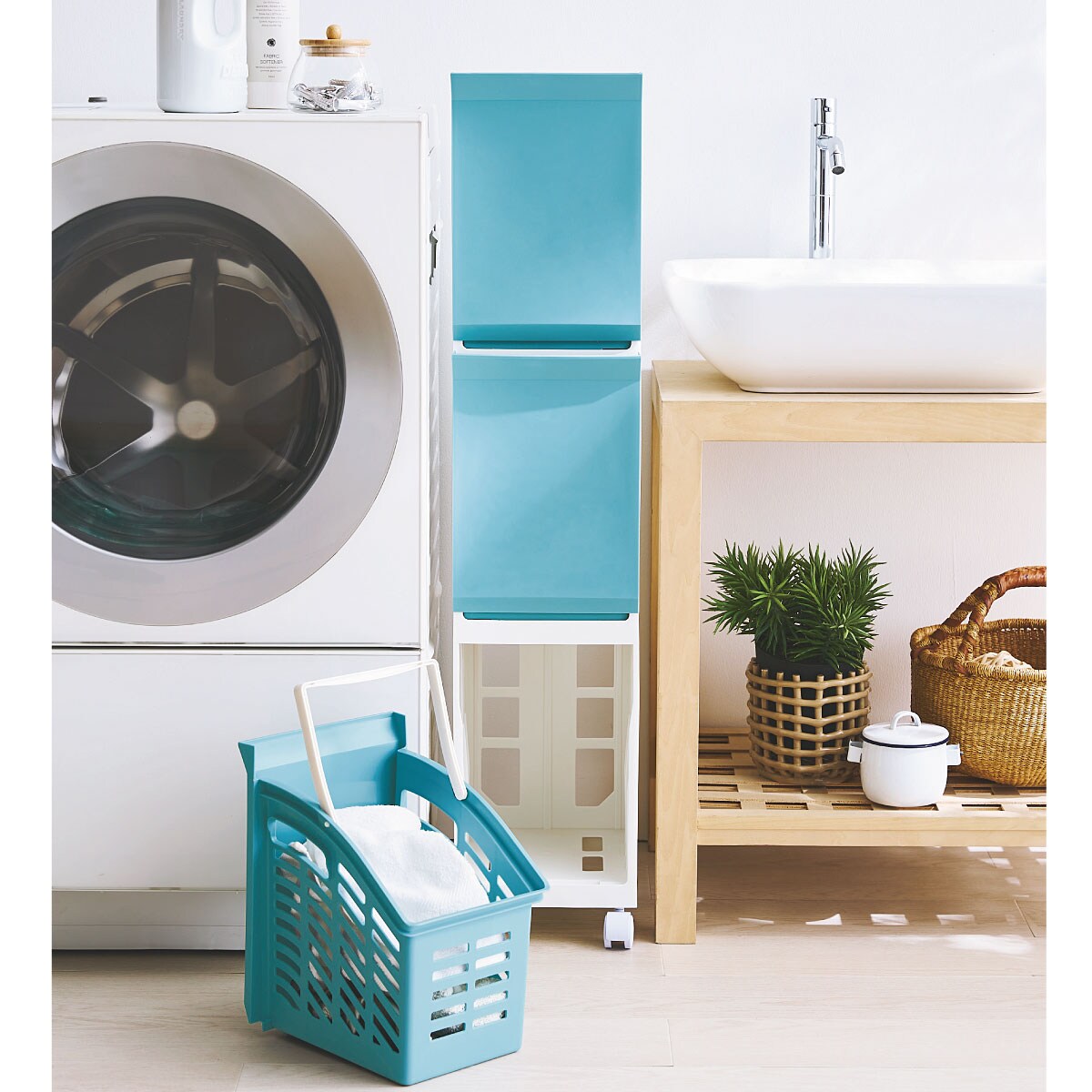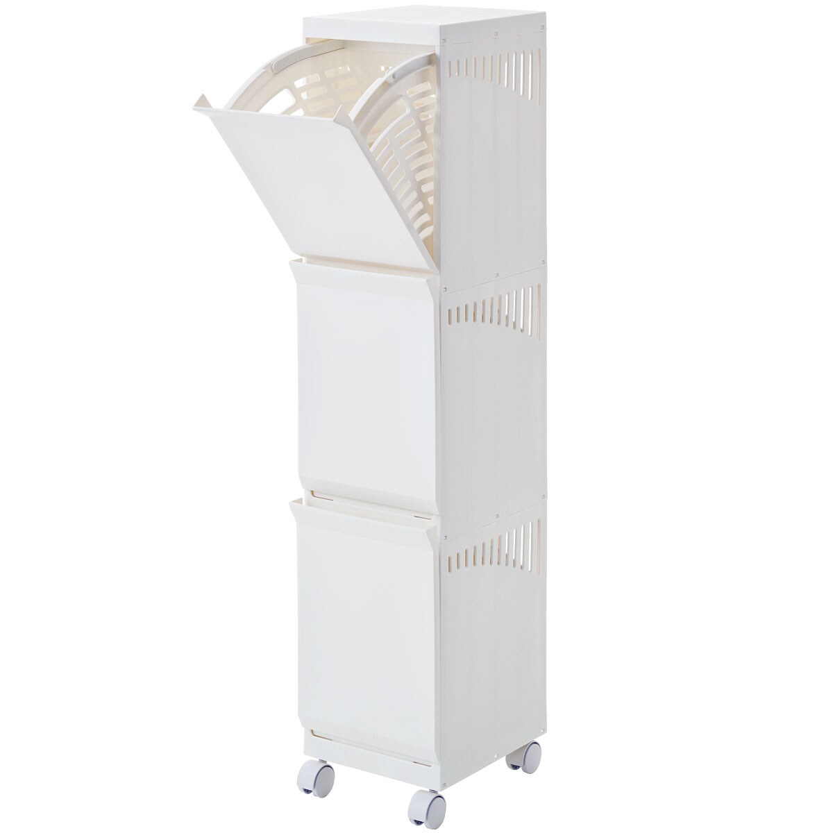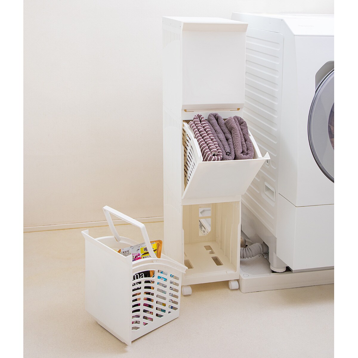分ける・干す・しまうの一台三役で洗面所がすっきり。バスケットにもなるランドリーワゴンです。洗面所のすき間を有効活用できるスリムタイプです。