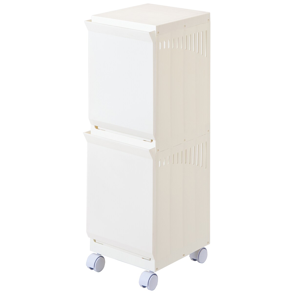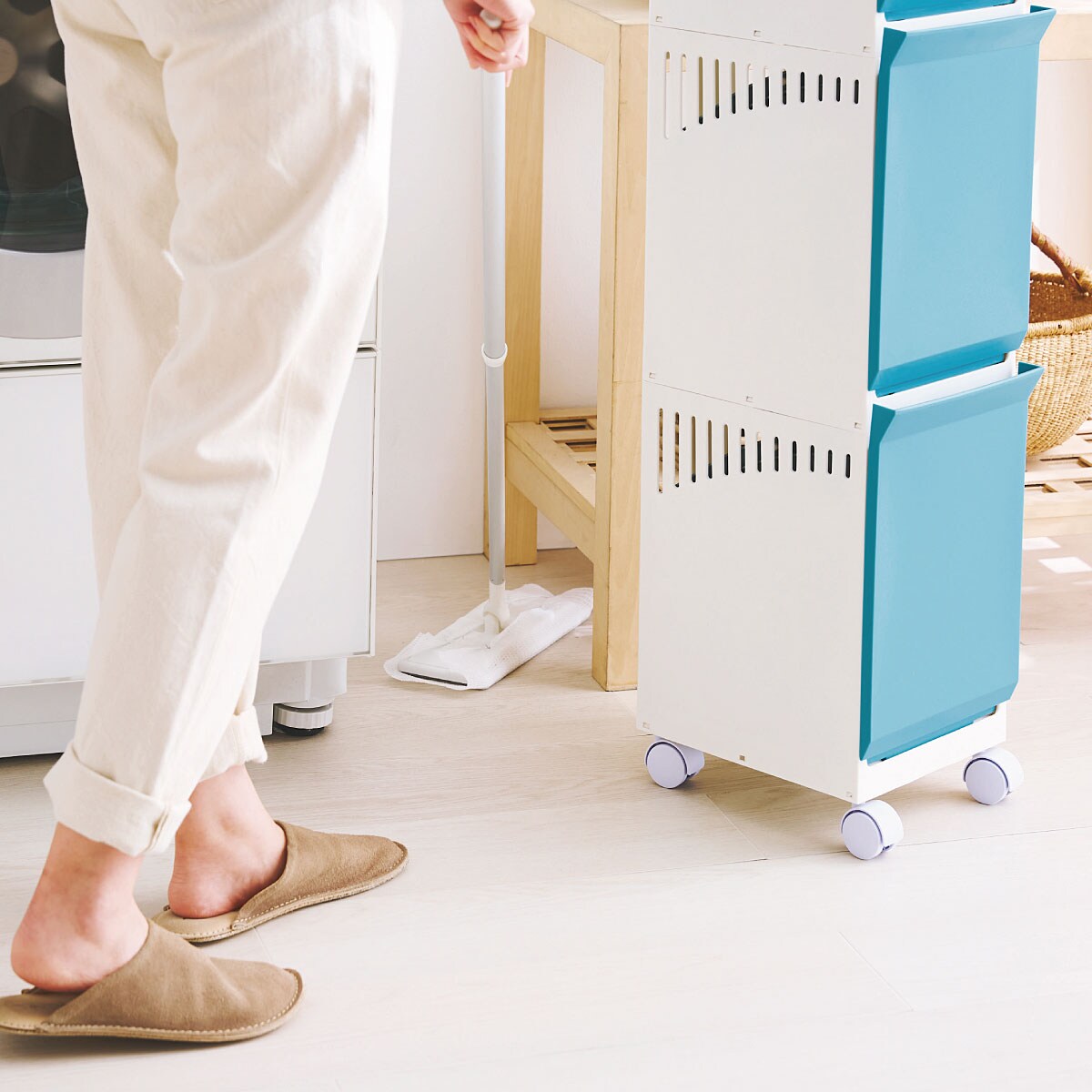 洗濯物の仕分けから干し場への移動はもちろん、取り込んだ後はそのまま収納もできて洗濯の導線が一本化できる! フラット扉で中身もすっきり隠せるランドリーワゴンです。背面と側面にスリットが入っているので通気性が良く、サニタリールームにぴったり。キャスター付きでお掃除もラクラクです。簡単に移動できるので用途に合わせて使いやすい場所へ移動できるのもうれしいポイント。散らかりがちなお子さまのおもちゃの収納や、キッチンでの収納にもおすすめ。汚れてもサッと拭けるのでお手入れもラクラクです。