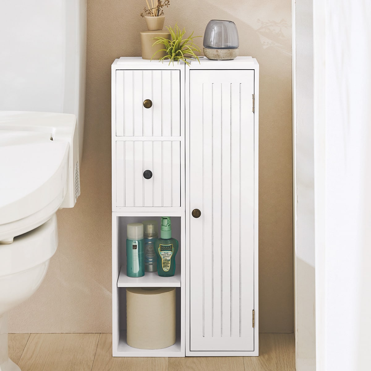 ホワイト (左から) B (引き出し2段)・A (オープン2段)・C (扉タイプ)スペースや収納したいものに合わせて簡単にスタッキングできるトイレ収納です。