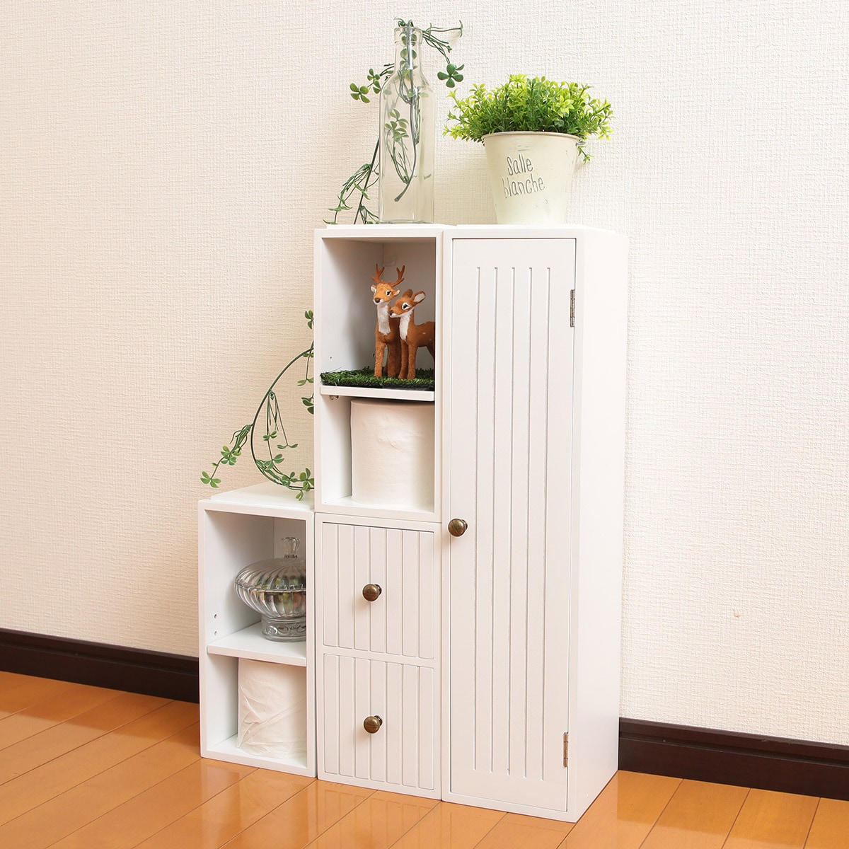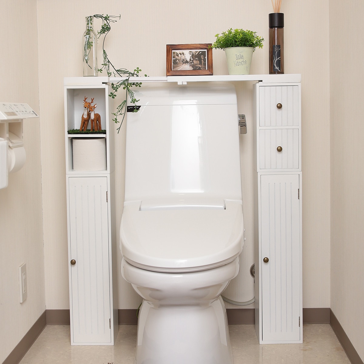 スペースや収納したいものに合わせて簡単にスタッキングできるトイレ収納です。観葉植物やフレグランスを飾るならオープンタイプ、隠したいものには引き出し・扉タイプがおすすめ。伸縮天板は両サイドの棚に渡らせてデッドスペースを有効活用できます。付属の金具でしっかり固定できるので、重ねても安心です。