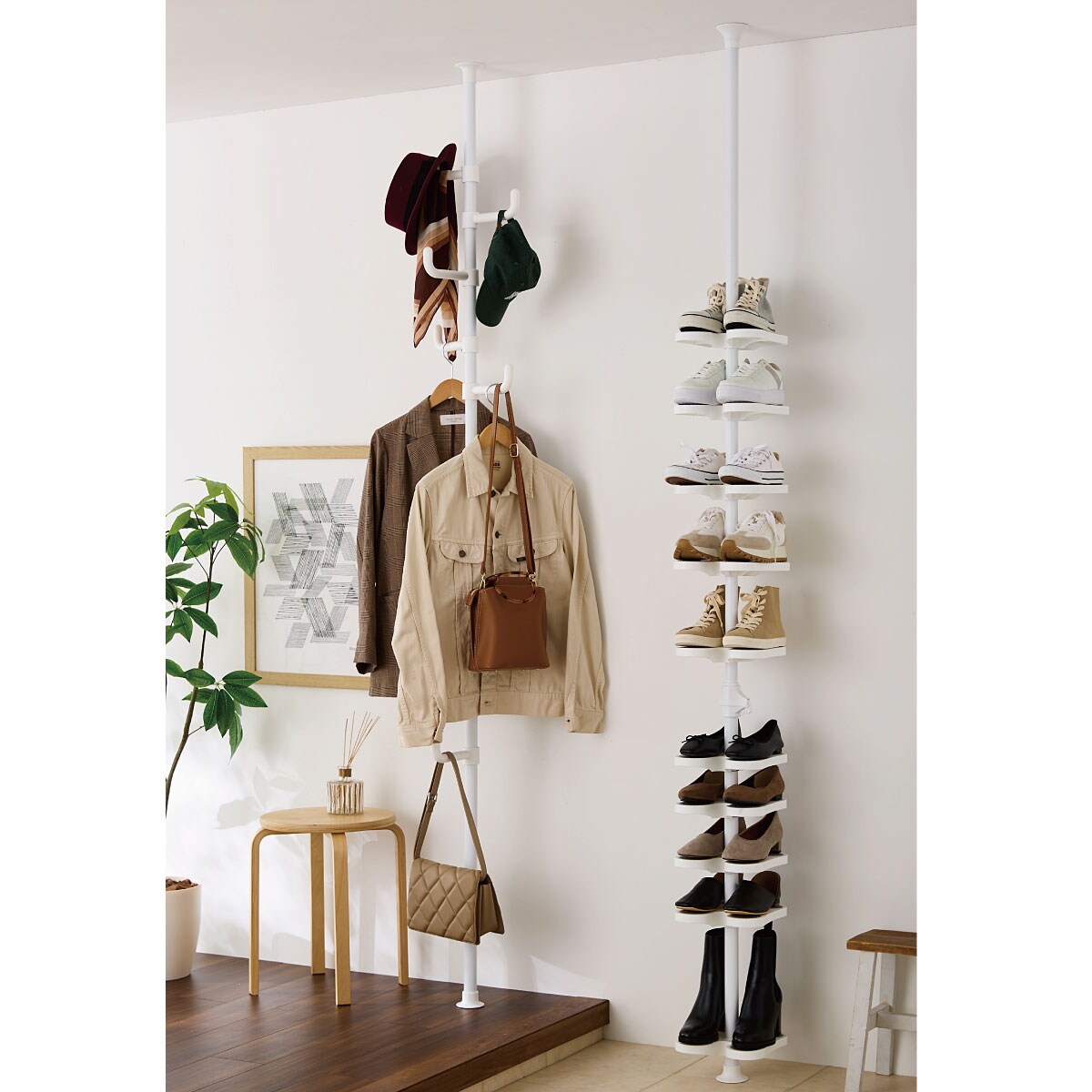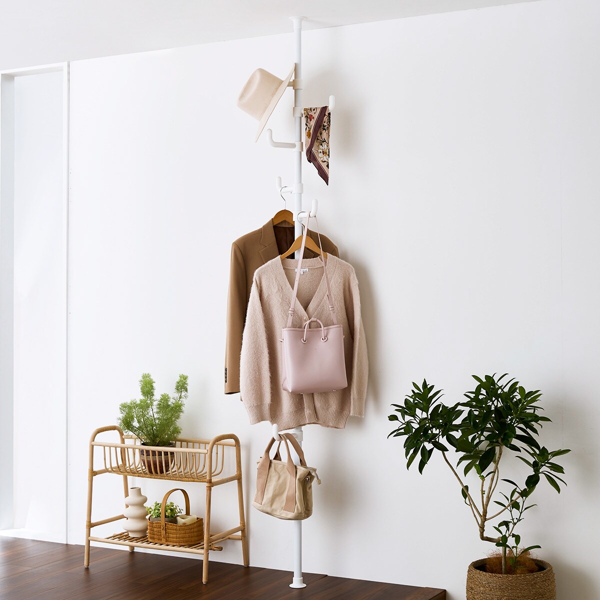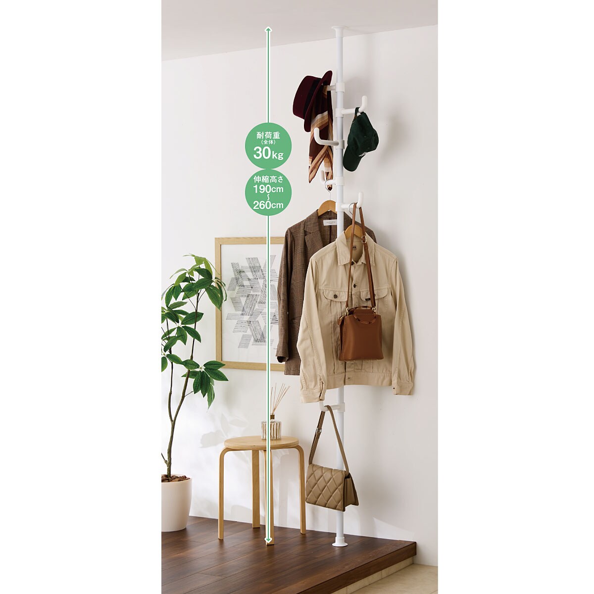 デッドスペースを有効活用! よく着るコートやバッグ、小物類をサッとかけてすぐに取り出せる便利なポールハンガーです。