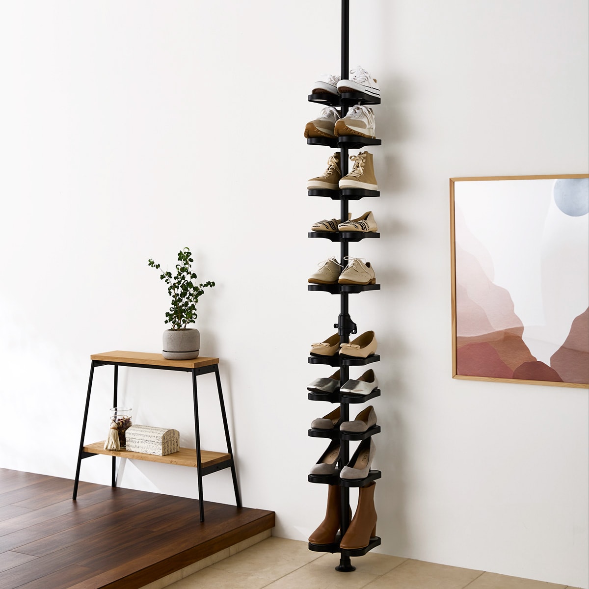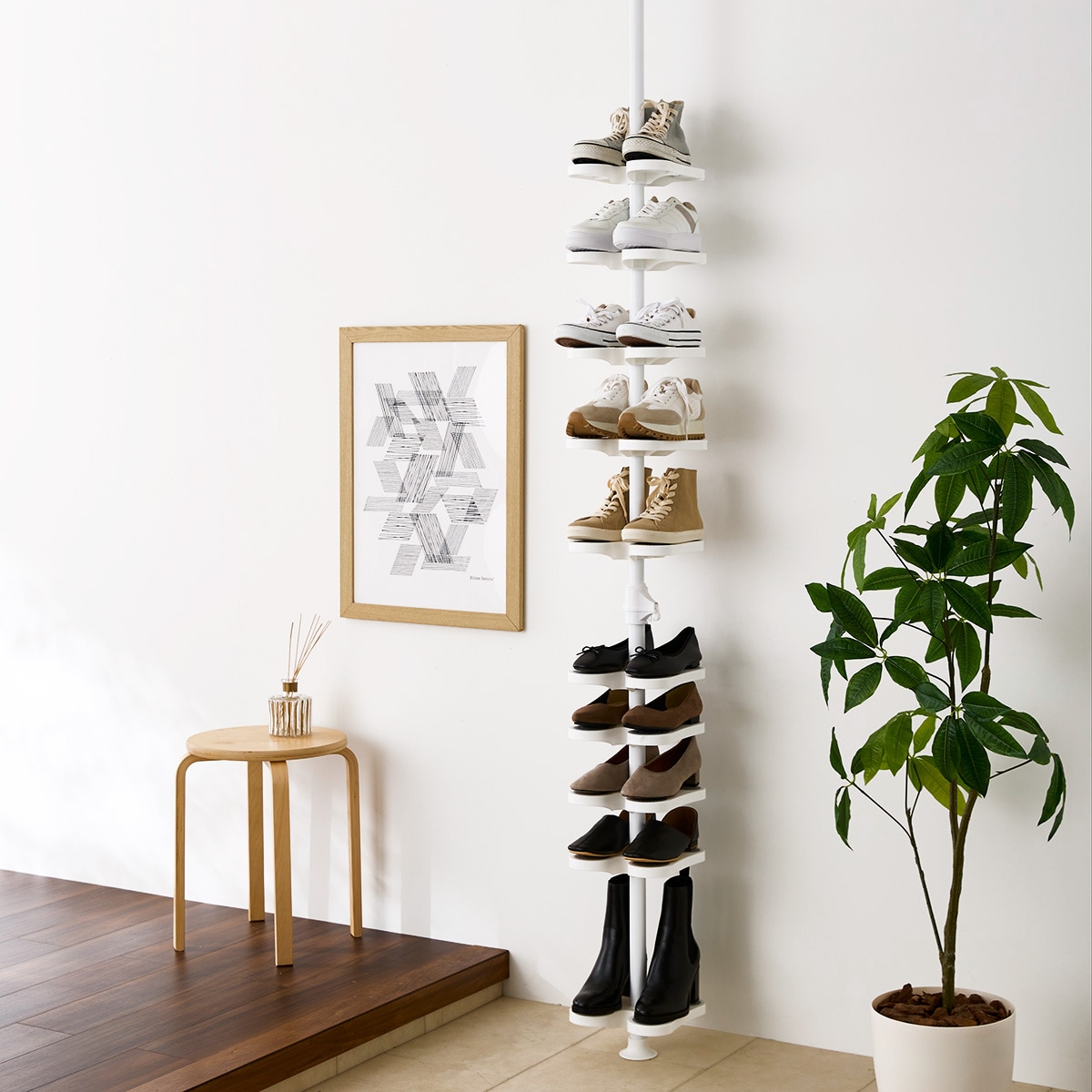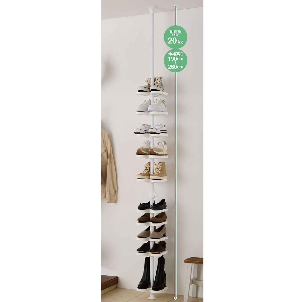 狭い玄関であふれる靴をスッキリ収納。天井近くのデッドスペースまで空間を有効活用する突っ張りシューズラックです。
