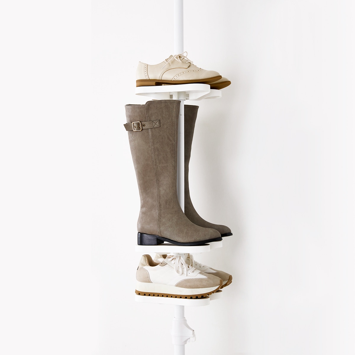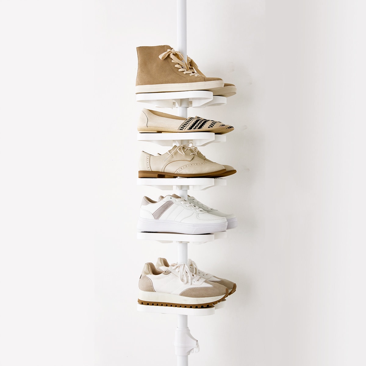 ワンタッチで突っ張るだけ!たて空間を有効活用できるシューズラックです。場所を取りがちな靴を省スペースにスッキリ収納できます。ポールを上下に引っ張るだけで簡単に設置可能なので、女性でもラクラクなのが嬉しいポイント。シューズトレイの高さはお手持ちの靴に合わせて調整していただけます。付属のゴムリングをずらして調整できるので工具不要で簡単!トレイは360度回転させられます。