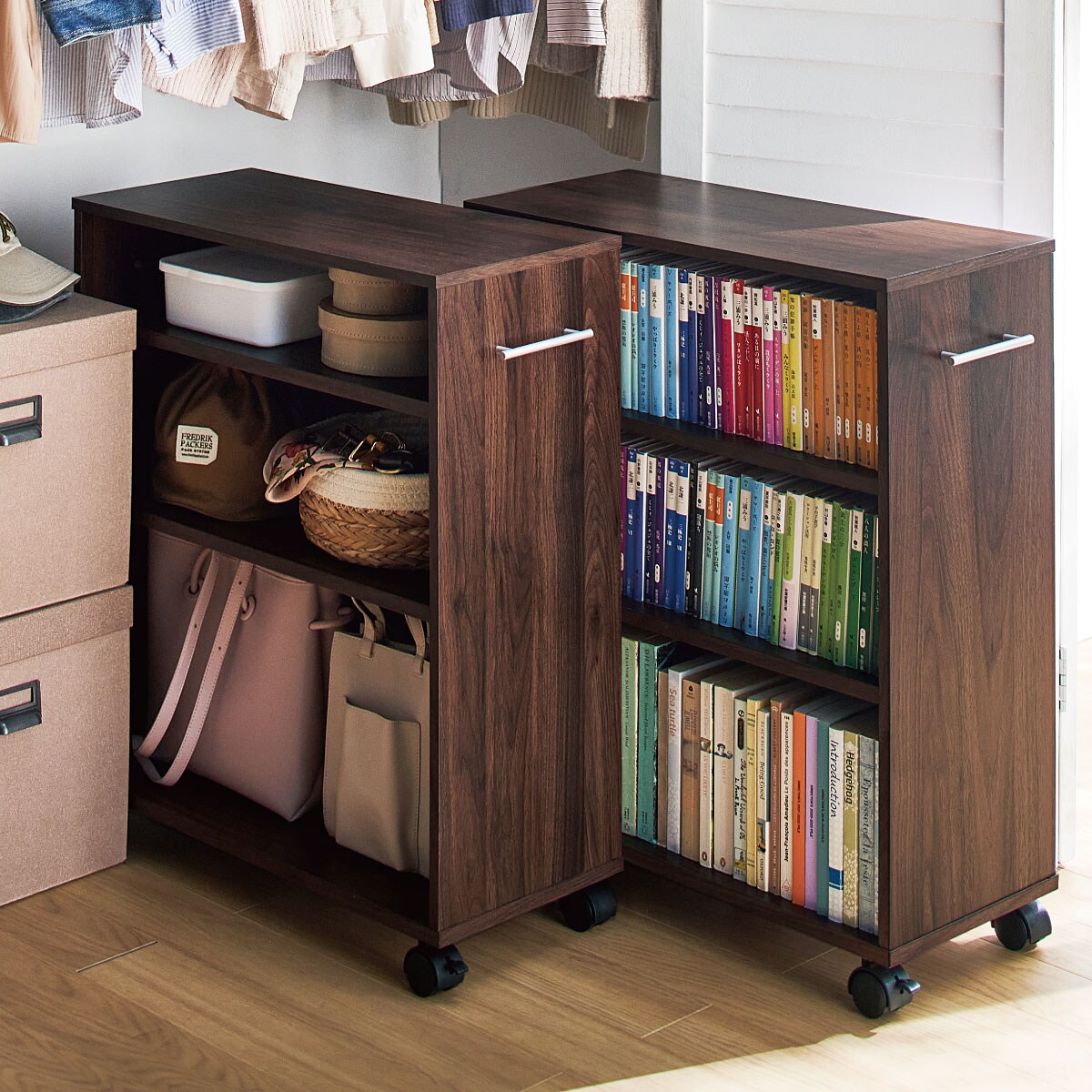 スッキリしまえて取り出しもラク! キャスター付きのクローゼット収納ブックワゴンです。バッグや小物、コミックなどをすっきり収納できます。