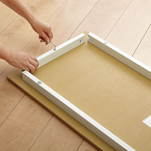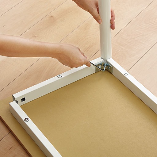 組み立て簡単。天板裏に補強パイプを取り付けます。