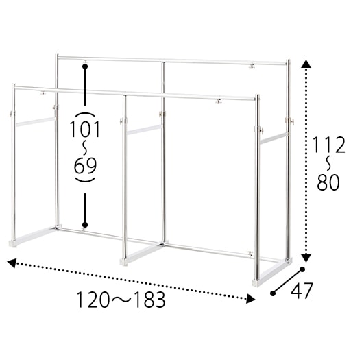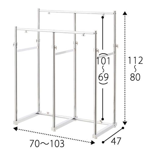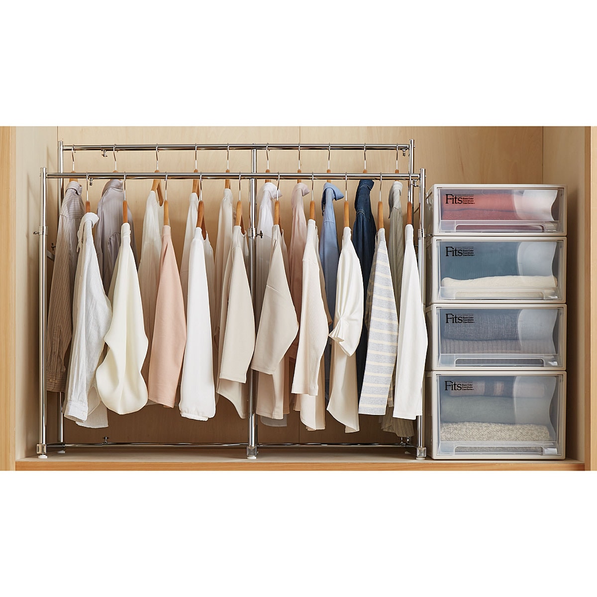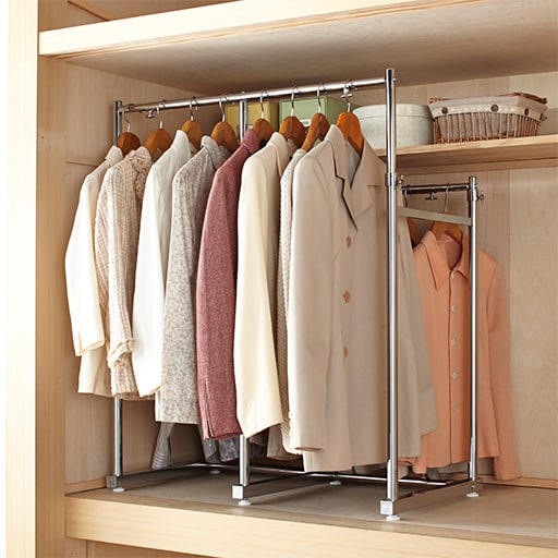 耐荷重は約70kg! 前後2段で洋服をどんどん掛けられる、頑丈構造のハンガーラックです。シーズンオンとオフの衣類を手前と奥に分けて掛ければ衣替えもスムーズ。洋服をたたむ手間からも解放されます。高さと幅を無段階で調整できるので、限られたスペースを無駄にしません。よく着る衣類は手前に掛けたり、丈が長いものは奥に掛けたりと、日常での使い分けも便利です。ガタつきを防ぐアジャスター付きで安定感もバッチリです。