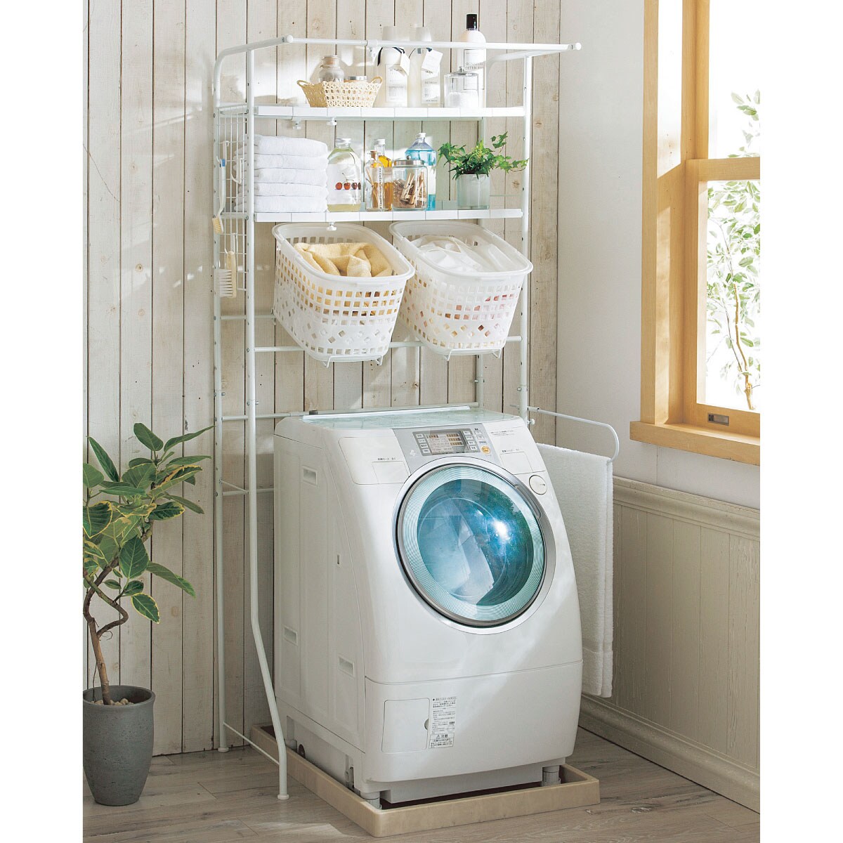 洗剤類からタオル・洗濯物まで、これ1台ですべて収まる洗濯機ラックです。棚板は洗剤類を乗せても安心の耐荷重5kg。分割式なので高いボトルも収納できます。バスタオルやバスマットを干すのに便利なタオルハンガーバーは、左右お好みの位置に取り付けられます。前後スライド式なので、使用しないときは奥に収納できて邪魔になりません。ラックを持ち上げれば洗濯機を動かさずに設置できるのもうれしいポイント。ごちゃごちゃしがちなサニタリーがすっきり片付いて、お洗濯もはかどります。
