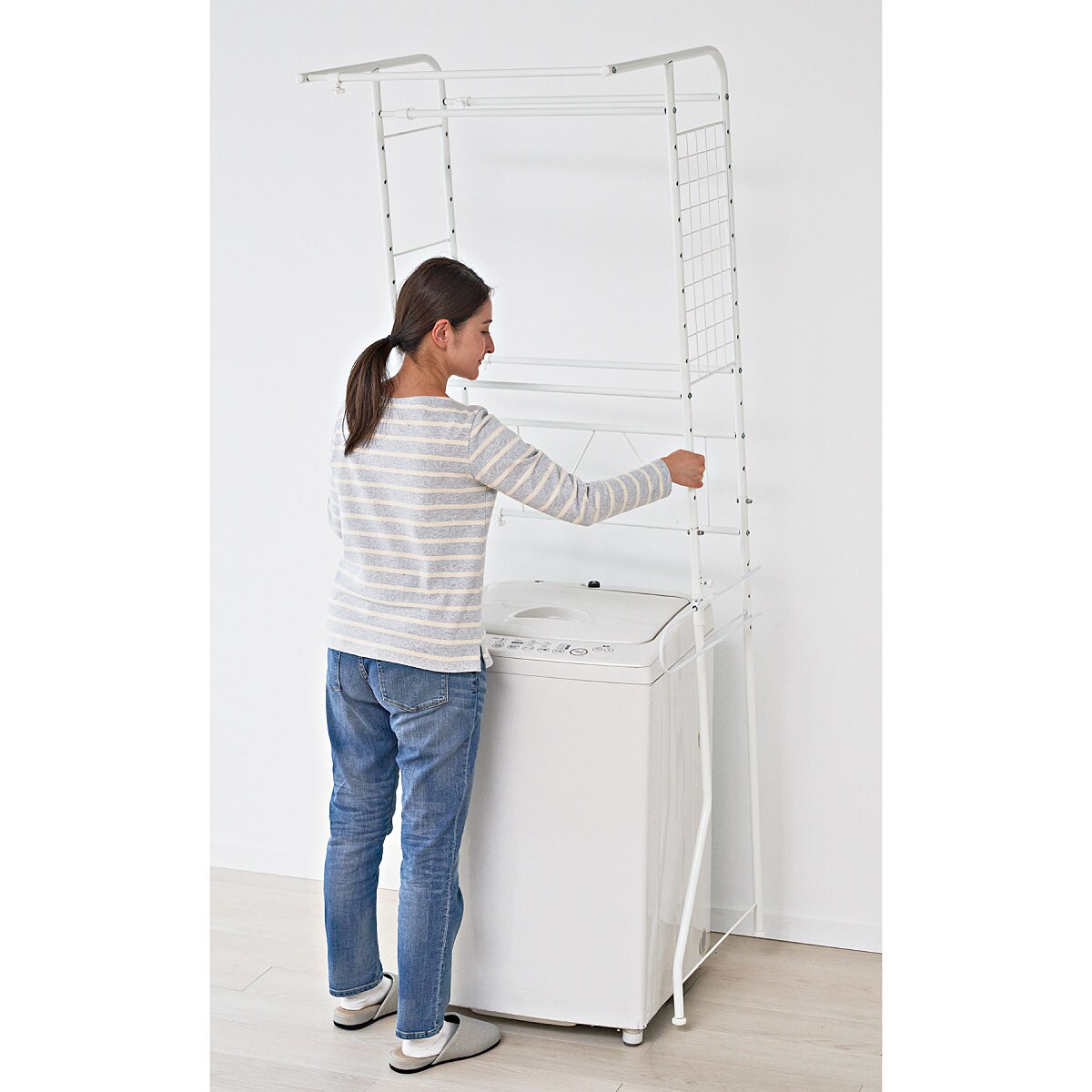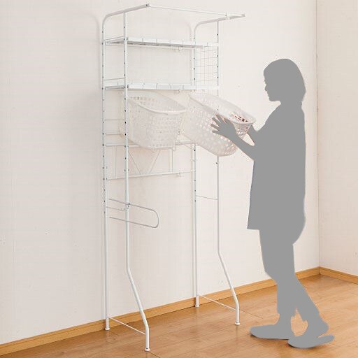C (棚2段+カゴ2個)ハンガーバーは脱水の終わったスウェットやジーンズなどの一時掛けなどに便利。