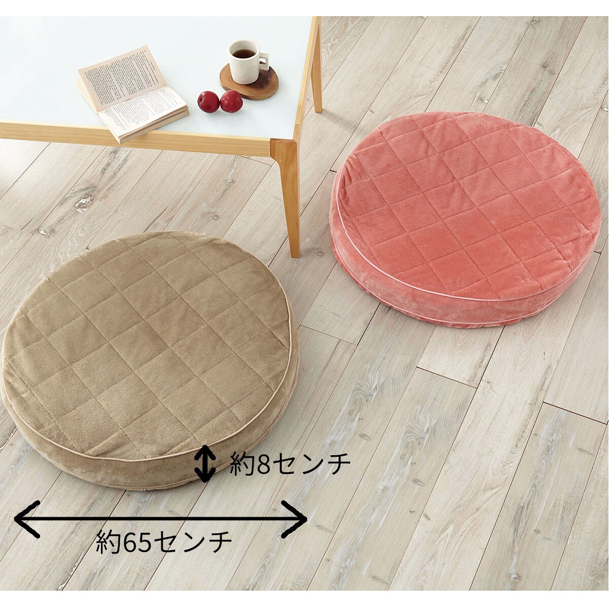 丸型のあったかキルト生地でリラックス。あぐらで座ってもはみ出さない、ゆったり座れるサイズの円形座布団(クッション)です。可愛い丸いフォルムが、お部屋のアクセントにもぴったり。同色2枚組でお届けします。