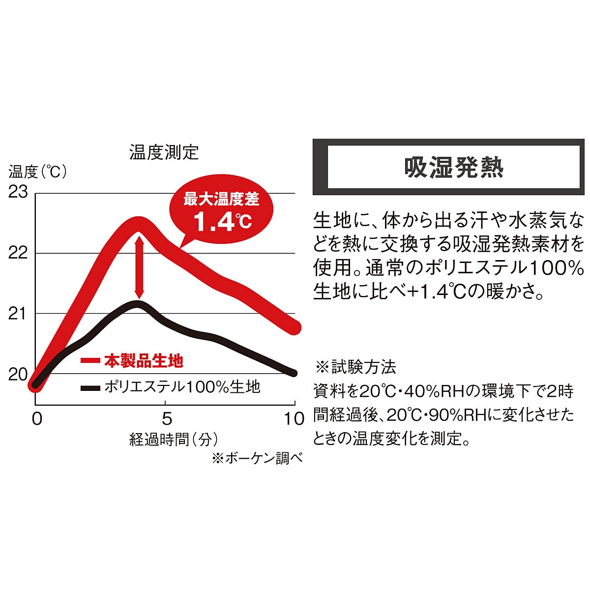 側生地に、体から出る汗や水蒸気などを熱に交換する吸湿発熱素材を使用。通常のポリエステル生地に比べ+1.4℃の暖かさ。