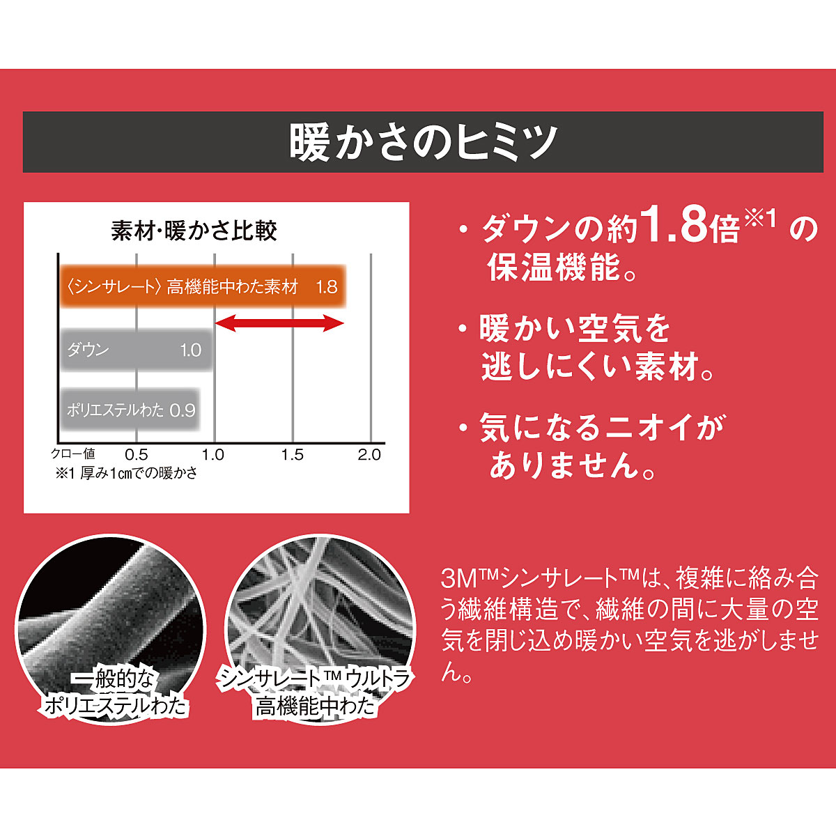 暖かさのヒミツ複雑に絡み合う繊維構造が暖かい空気を閉じ込め、逃がしません。
