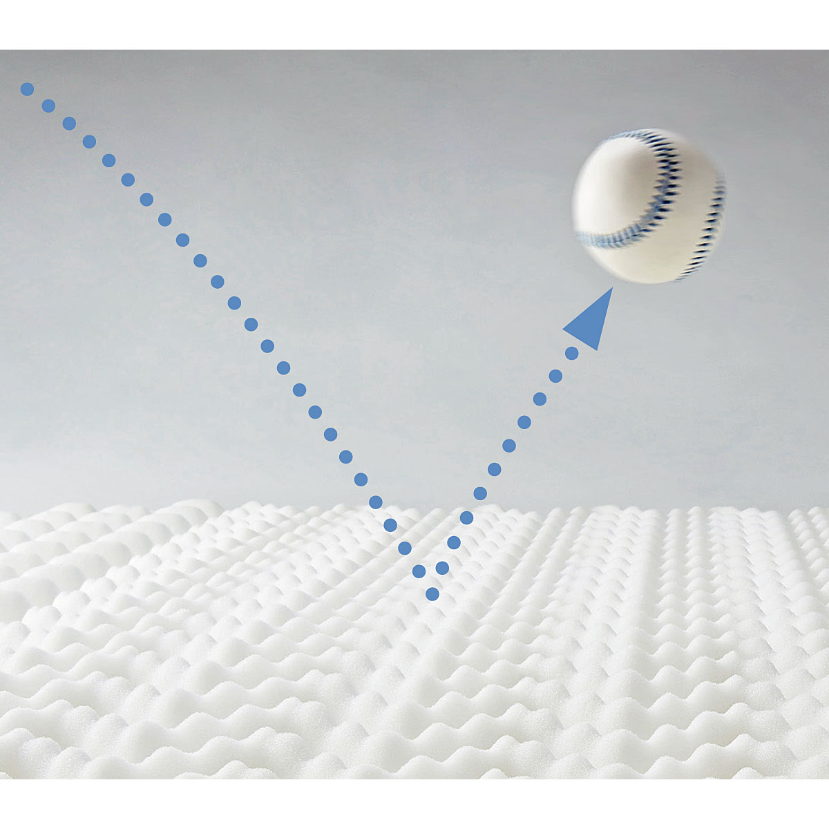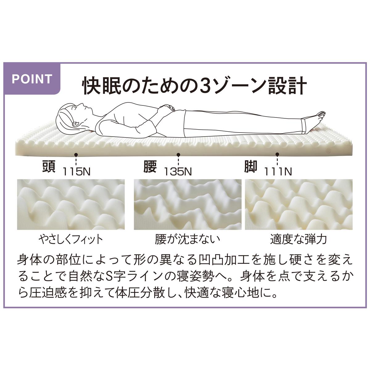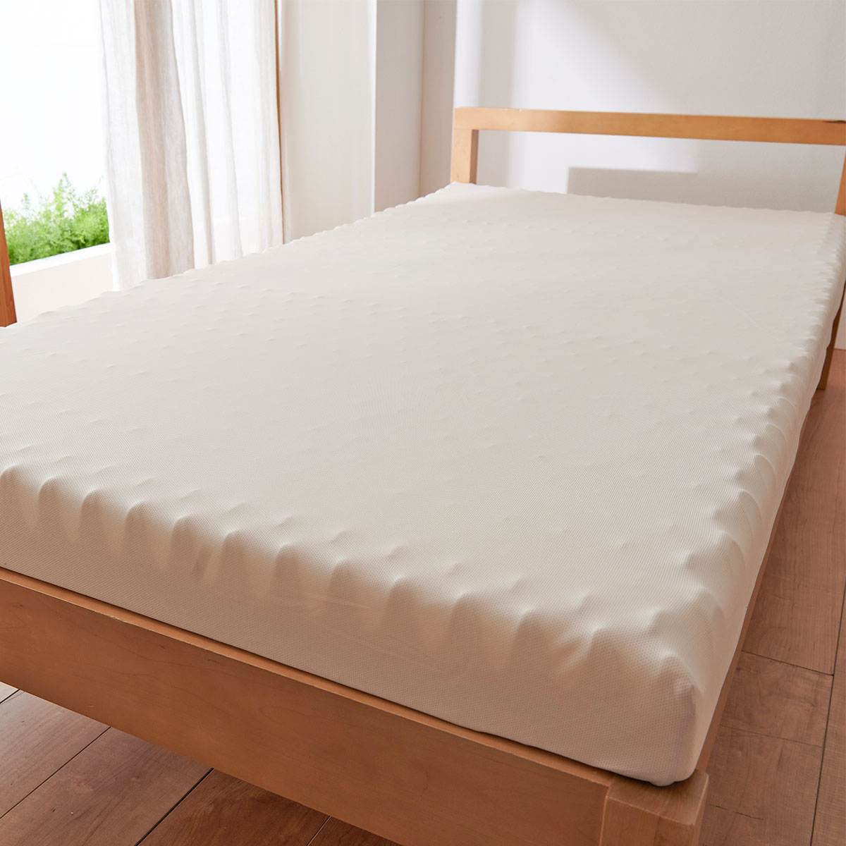 睡眠時、肩や腰などの局部に体圧が集中すると血行を妨げ、眠りの質を低下させる原因に。そこで、脚部・頭部・腰部で形の異なる凹凸加工を施し、さらにそれぞれの硬さを変えることで立っているときのような「自然な寝姿」を実現するマットレスを作りました。しっかりとした弾力の高反発ウレタンを使用し、自然なS字ラインをキープ。身体を点で支えるやわらかな感覚で、さらに快適な寝心地に。継ぎ目が気にならないシートタイプなので、そのままベッドマットレスとしても、お使いの寝具にプラスしてもおすすめです。カバーは洗濯機で気軽に洗えます。