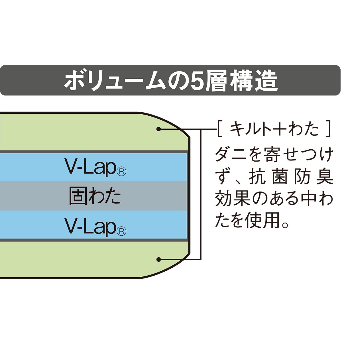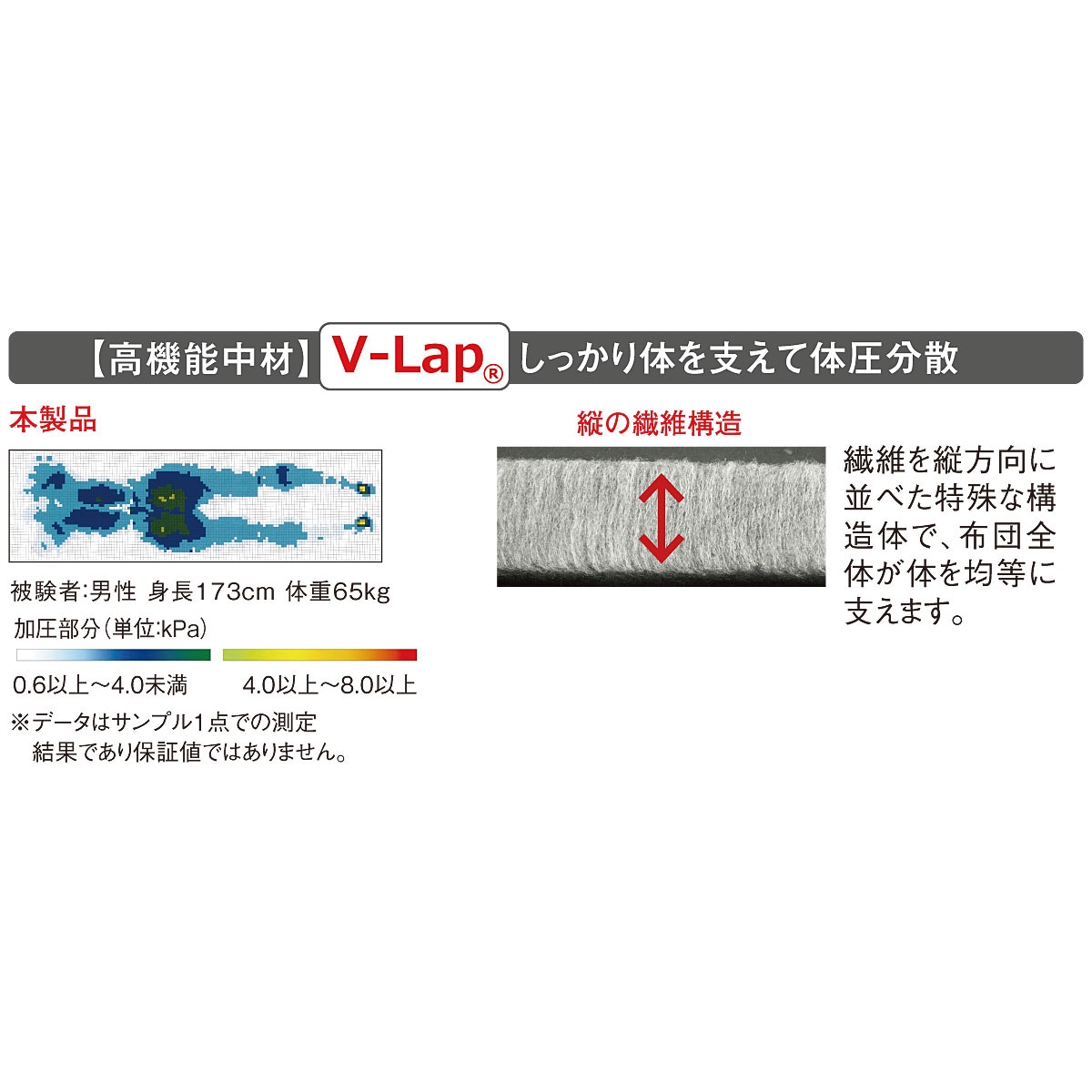 体圧分散性が良く、沈み込みやすい腰部をしっかり支え、自然な寝姿勢へと促す敷き布団です。固わたを高機能中材「V-Lap®」2枚でサンドした、リッチなボリュームの5層構造。床付き感がなく快適な寝心地です。中わたには帝人フロンティア製の「マイティトップ®Ⅱad ECO」を使用しました。防ダニ・抗菌防臭加工を施してあるので清潔に使えます。品質にとことんこだわった日本製です。
