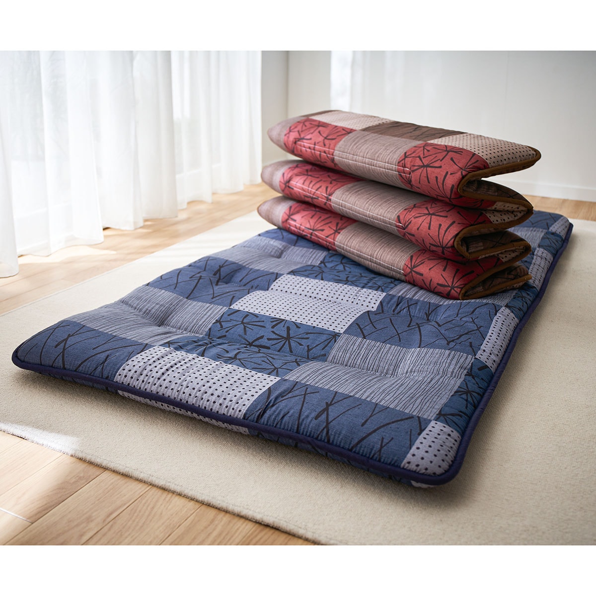 六つ折れ仕様で持ち運びやすく、収納しやすい敷き布団です。たたんだ状態の奥行きは約33cm。コンパクトにたためてクローゼットや壁とチェストの隙間などにも収納できるので、来客用の布団としてもおすすめです。固わた入りで床付き感も軽減。格子柄のおしゃれなカラーをご用意しました。