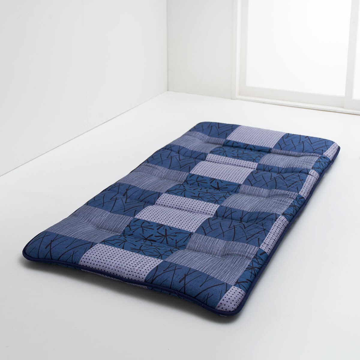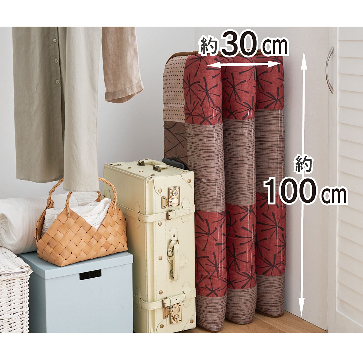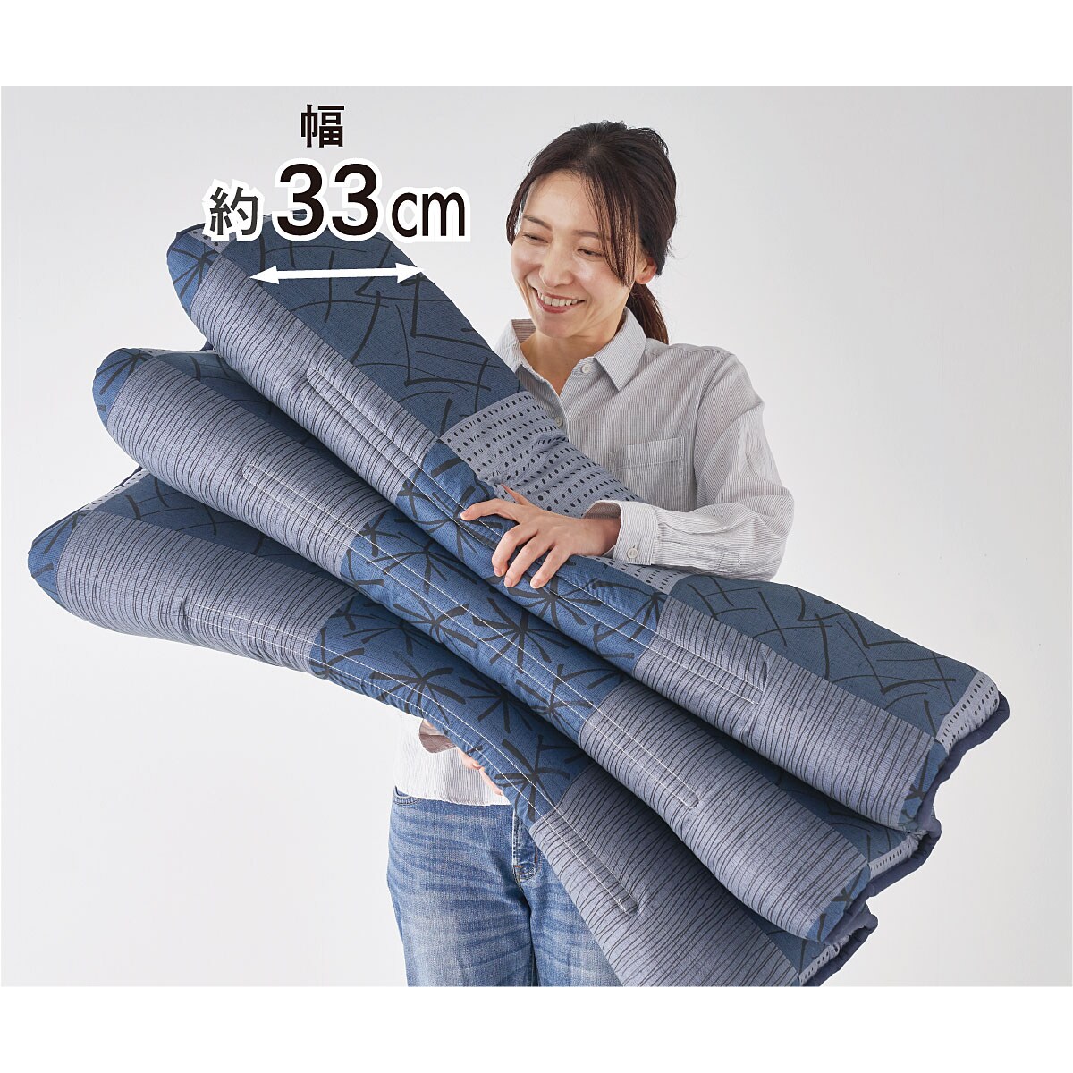 六つ折れ仕様で持ち運びやすく、収納しやすい敷き布団です。たたんだ状態の奥行きは約33cm。コンパクトにたためてクローゼットや壁とチェストの隙間などにも収納できるので、来客用の布団としてもおすすめです。固わた入りで床付き感も軽減。格子柄のおしゃれなカラーをご用意しました。