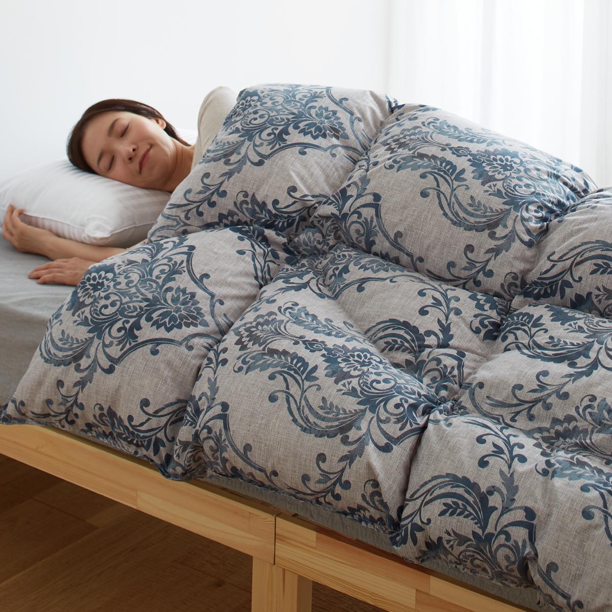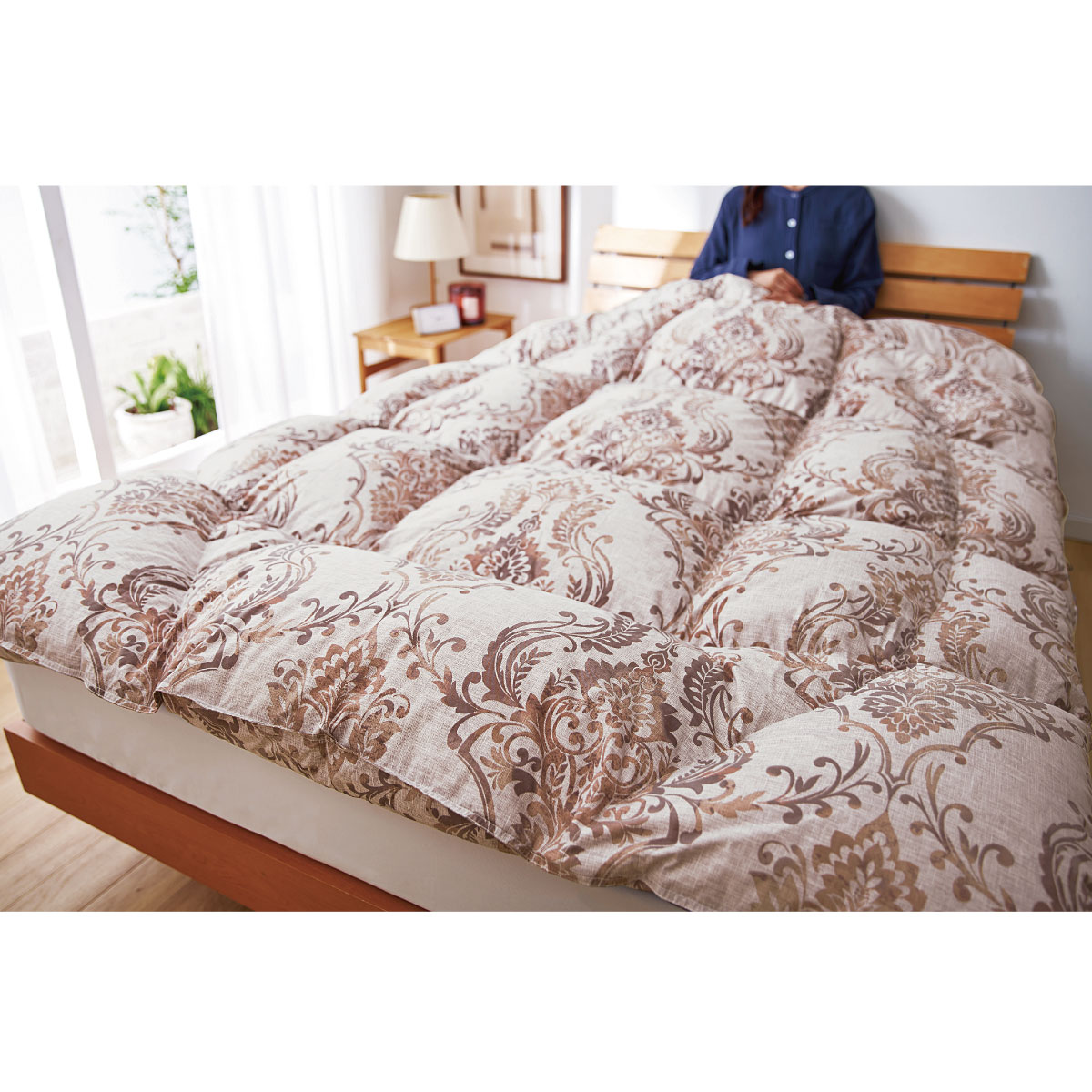 ダウンは暖気をたくさん含み保温性が良く、さらに立体キルト仕様で、あたたかさが均一に。吸放湿性に優れ、ムレを感じにくく、快適な寝心地を保てます。ふっくらと軽いので扱いやすく、寝返りしやすい。キルトラインで身体にすき間ができにくく暖かい。センターライン部に羽毛を増量し、身体に心地よくフィット。足元からの冷えを防ぐため、足元部に羽毛を増量。