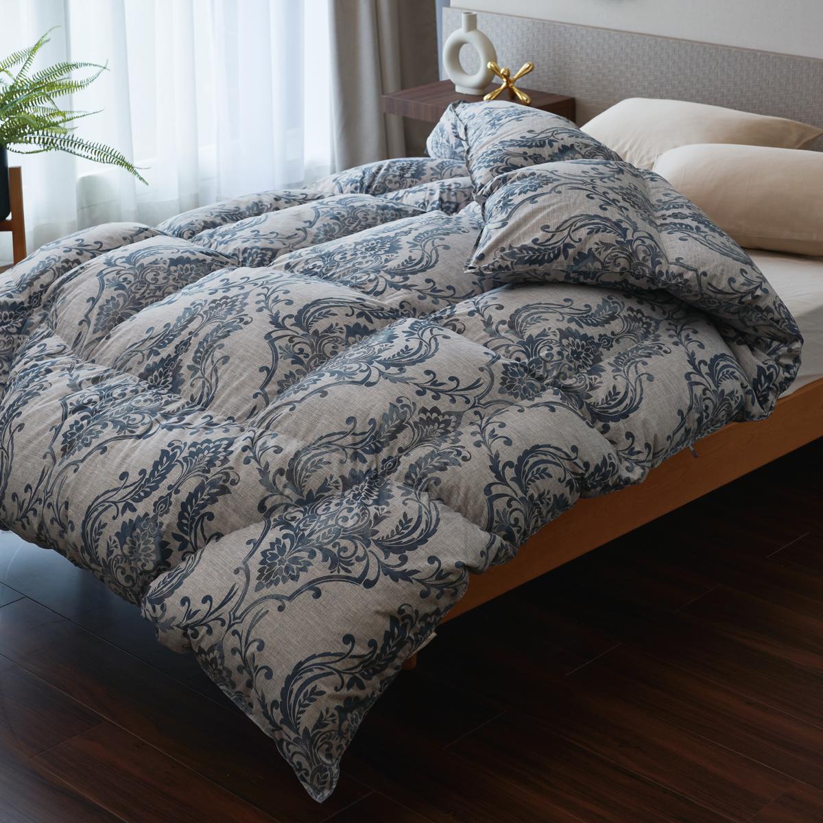 ダウンは暖気をたくさん含み保温性が良く、さらに立体キルト仕様で、あたたかさが均一に。吸放湿性に優れ、ムレを感じにくく、快適な寝心地を保てます。ふっくらと軽いので扱いやすく、寝返りしやすい。キルトラインで身体にすき間ができにくく暖かい。センターライン部に羽毛を増量し、身体に心地よくフィット。足元からの冷えを防ぐため、足元部に羽毛を増量。