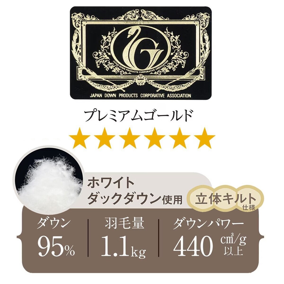 足が冷えて眠れない方におすすめ! 足元・センターラインに羽毛を増量した、あったか設計のプレミアムゴールド羽毛掛け布団です。