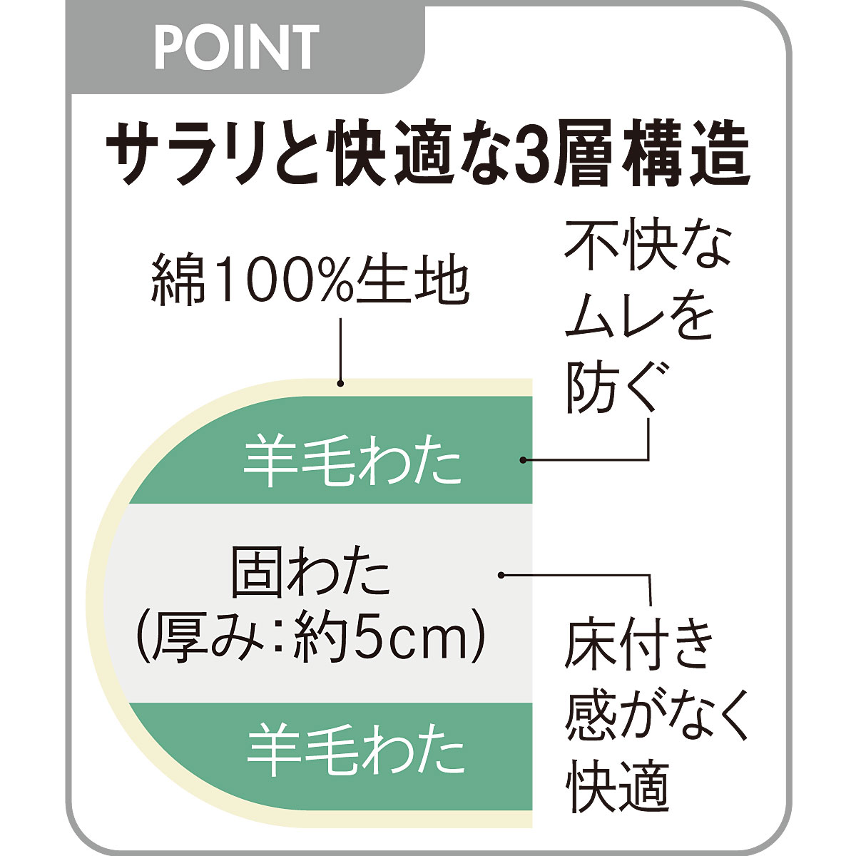 弾力性がありやわらかな寝心地の羊毛100%の敷き布団です。こだわりの4層構造でさらりとした寝心地が魅力。