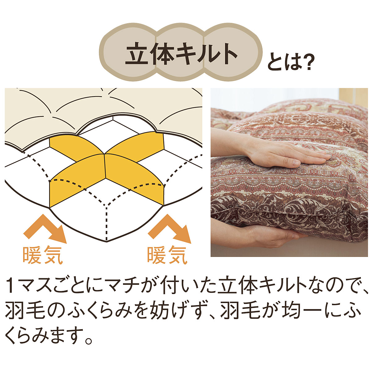 1マスごとにマチが付いた立体キルト仕様で羽毛のふくらみを妨げず、贅沢なボリューム感に。