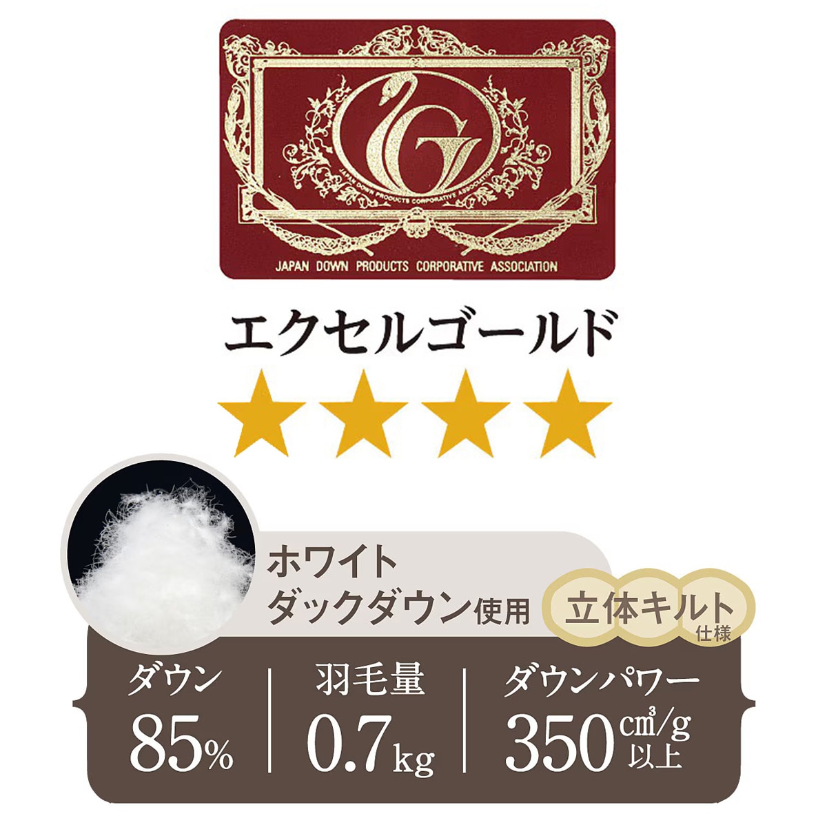 ダウンパワー350立方cm/g以上! 羽毛量0.7kg使用。エクセルゴールドラベルの商品です。